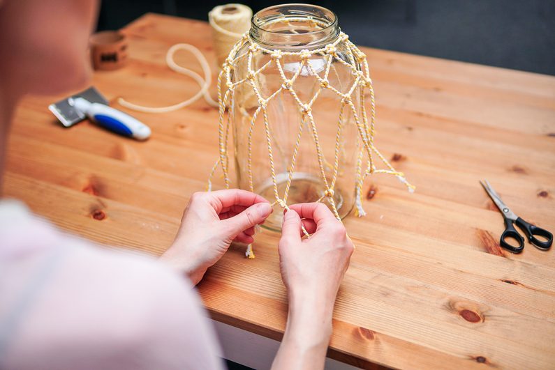 • Připravíme si prázdnou sklenici, kterou pečlivě umyjeme. Z macramé příze si ustřihneme 1 kus vodící příze, která bude mít dvojnásobnou délku sklenice + délku obvodu hrdla sklenice. Dále budeme potřebovat příze o dvojnásobné délce sklenice. Jejich počet závisí na požadované hustotě vzoru. Jen je potřeba mít připravený lichý počet. V našem případě bylo jich bylo použito 9.