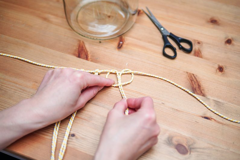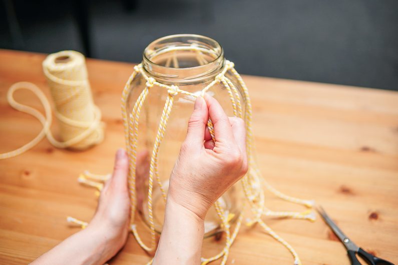 • Všech 9 přízí upevníme na vodící přízi tzv. základním upevňovacím uzlem. Následně touto vodící přízí obepneme hrdlo sklenice a klasickým uzlíkem stáhneme.