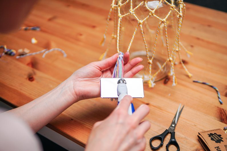 • Etiketa z příze nám může posloužit jako šablona pro tvorbu střapců. Přízi kolem etikety  párkrát omotáme, na jedné straně rozstřihneme a vložíme na poslední uzlík vzniklé pavučiny. Omotáme hlavičku střapce a stáhneme opět klasickým uzlíkem.