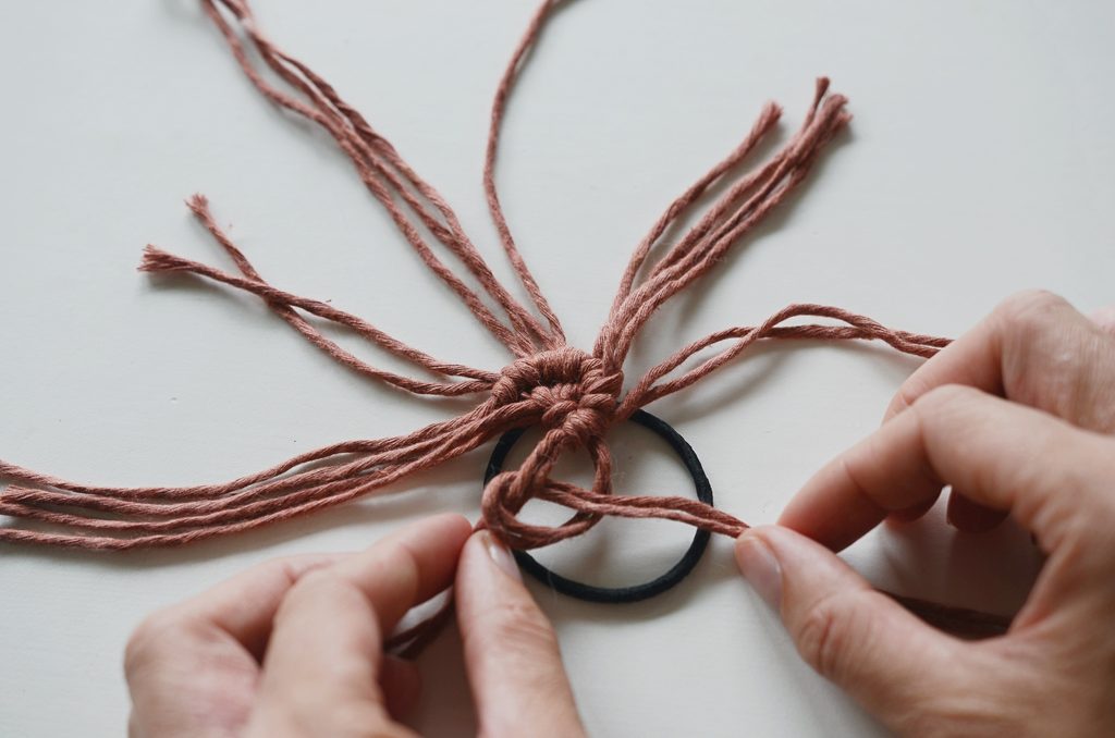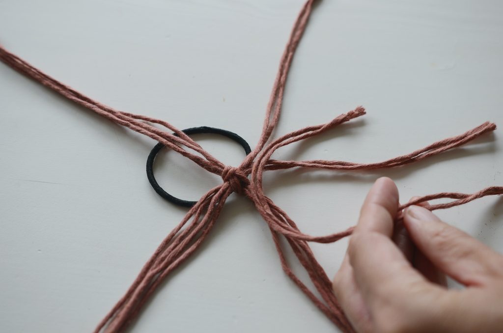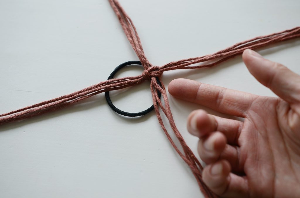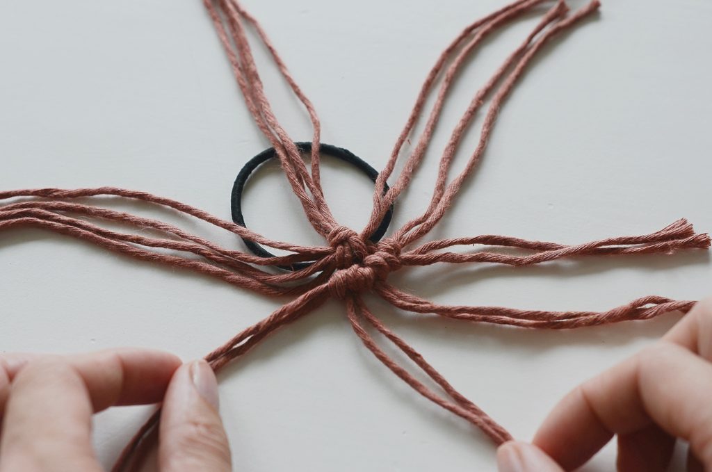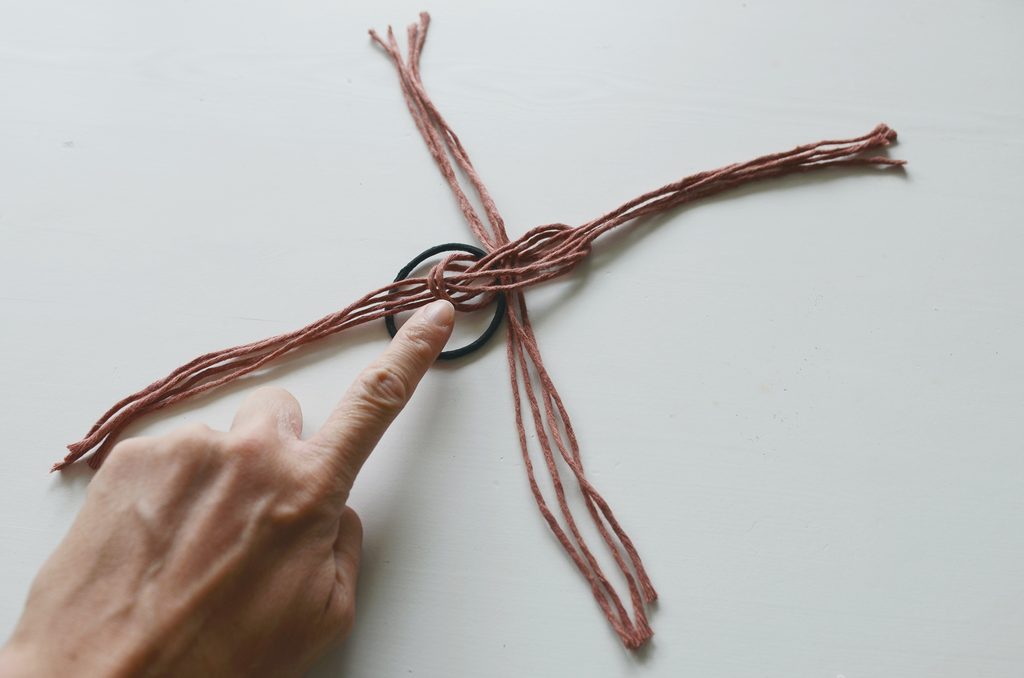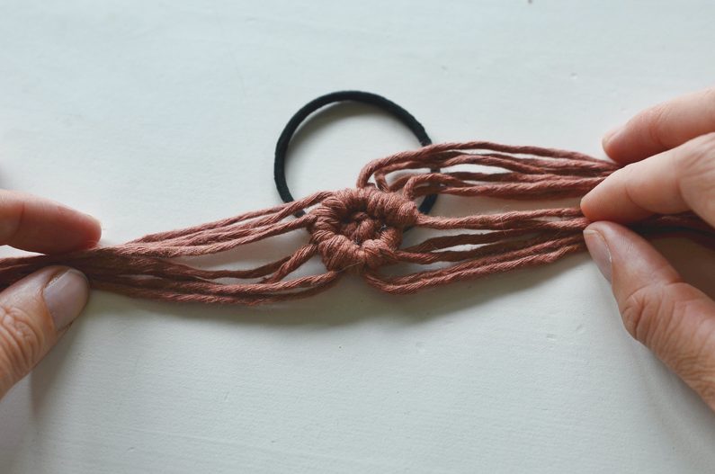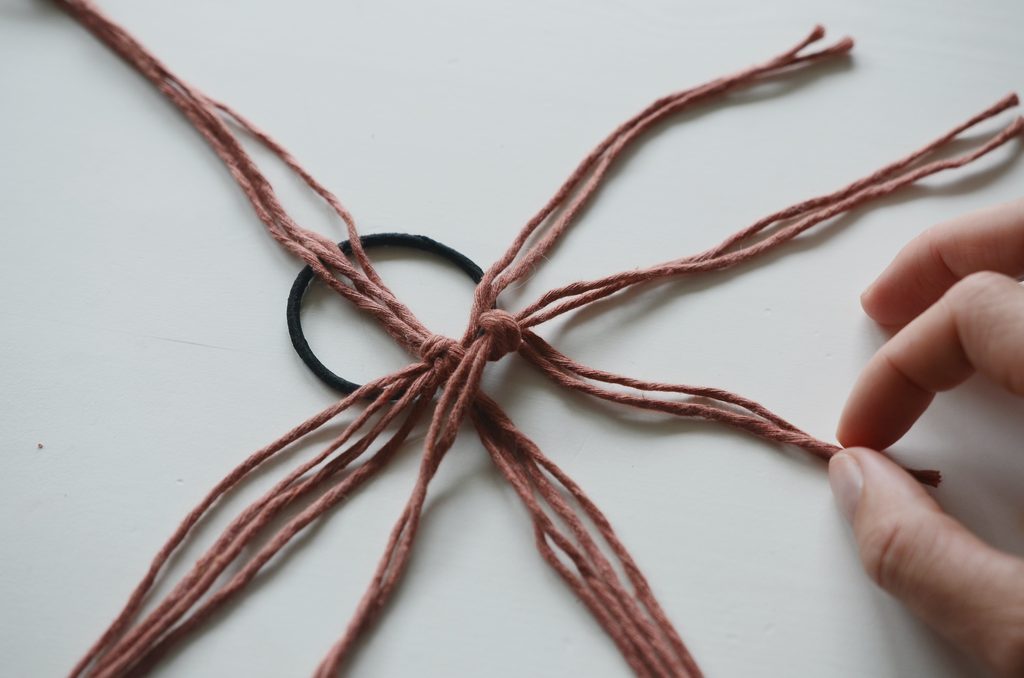 Konce rozdělte na dvě poloviny a svažte vždy párem 20 cm dlouhých šňůr. Klasický dvojitý uzlík schovejte dospod. Pevně stáhněte, aby byl střed mírně vystouplý.