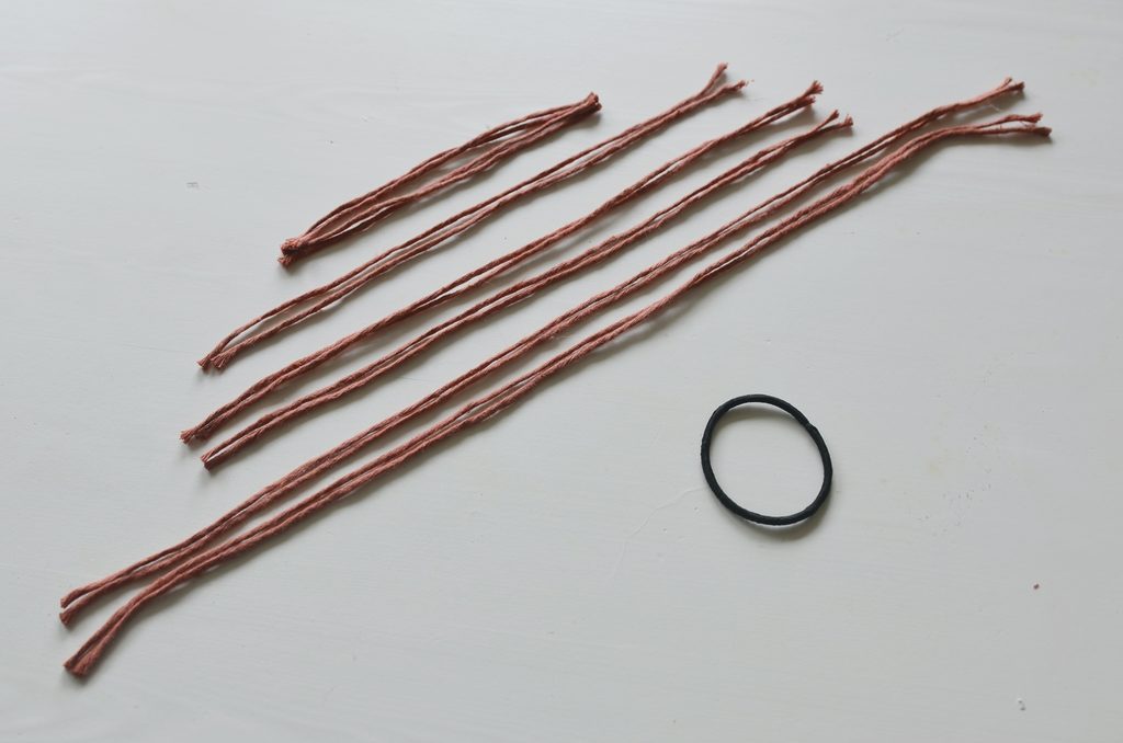 Odměřte si šňůry o následujících délkách: 4x45 cm, 4x35 cm, 2x30 cm a 4x 20 cm. Šňůry budete používat zdvojeně.