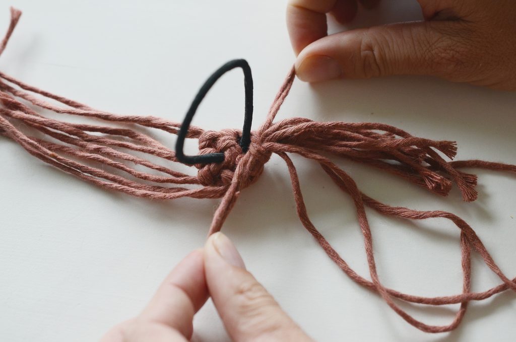 Nyní vezměte pár 30 cm dlouhých šňůr a dvojitým kroužkovacím macramé uzlem na ni navažte jeden pár 35 cm dlouhých šňůr podle vzoru.
