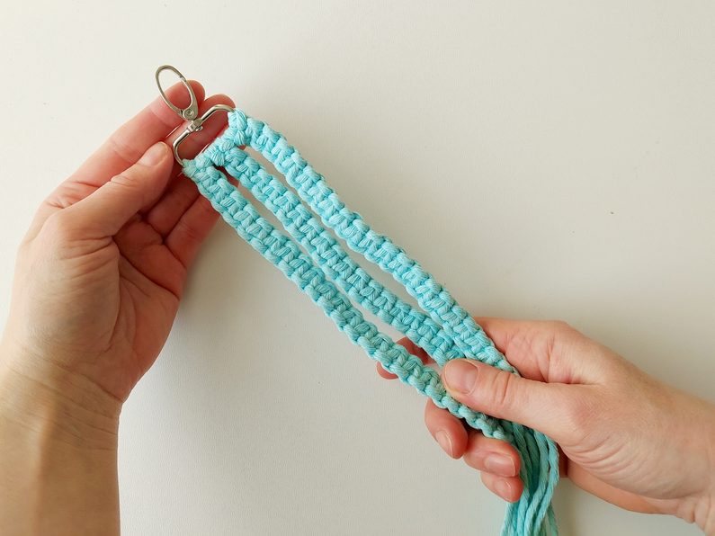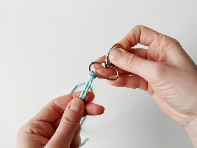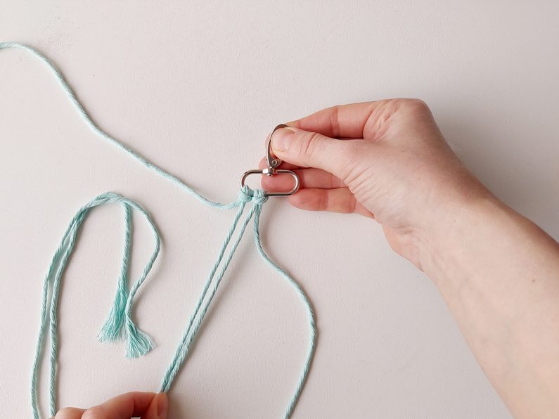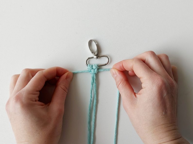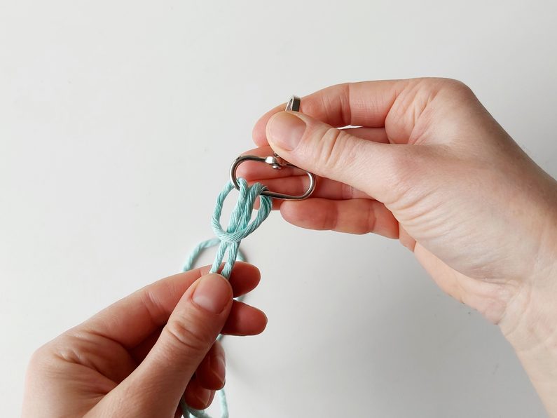 Připravíme si 6 kusů příze o délce 1,4 m, které provlékneme na karabinu základním upevňovacím uzlem. Každá z dvojice přízí by měla prostřední příze mít v délce, která bude odpovídat finální velikosti. Krajní příze budou vždy delší.
