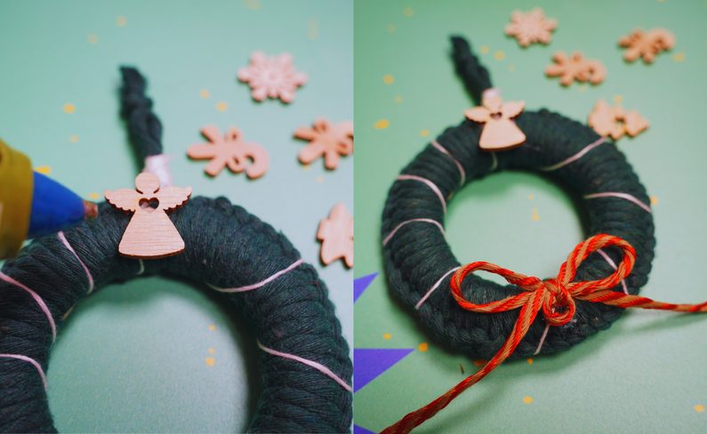 • Nakonec tavnou pistolí přilepte podle své fantazie dřevěné výřezy a mašličky.