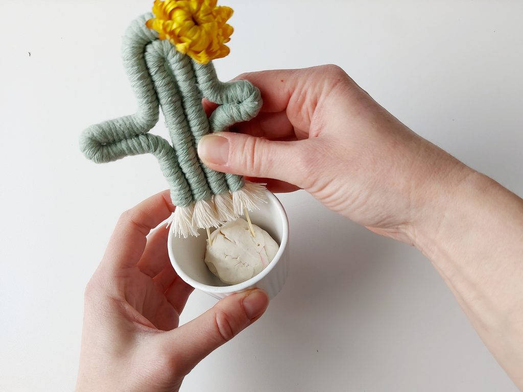 Do květináče si vložíme hroudu samotvrdnoucí hmoty, do které následně kaktus upevníme. Celý květináč pak můžeme zasypat třeba pískem.