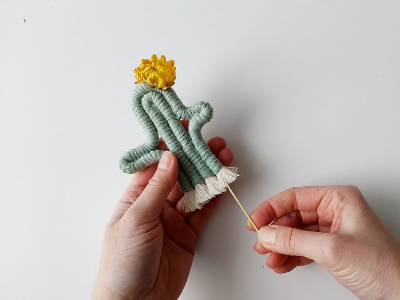 Zastříhneme konce přízí, případně můžeme rozčesat. Přilepíme sušený květ.