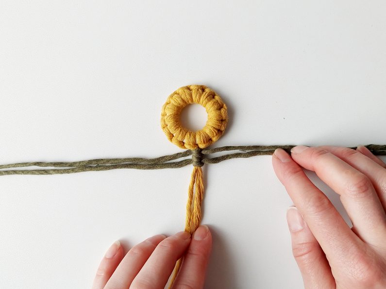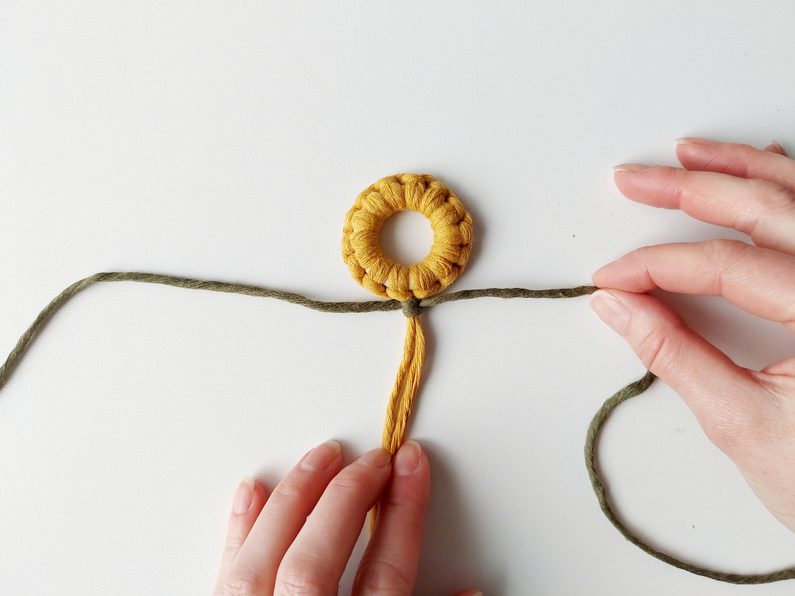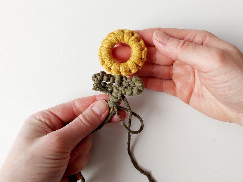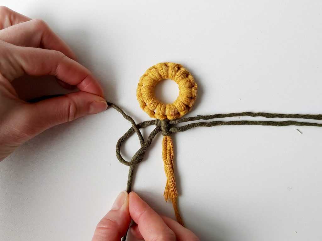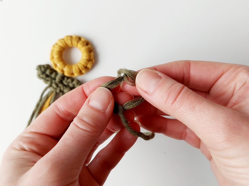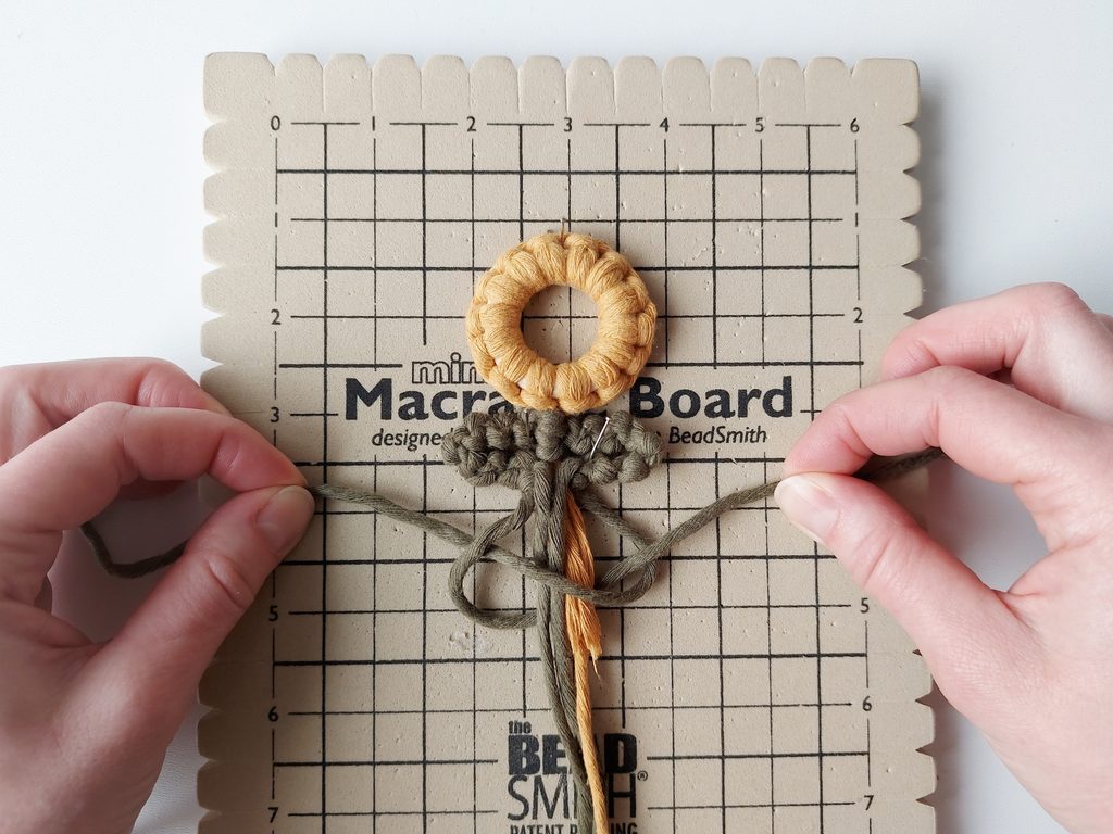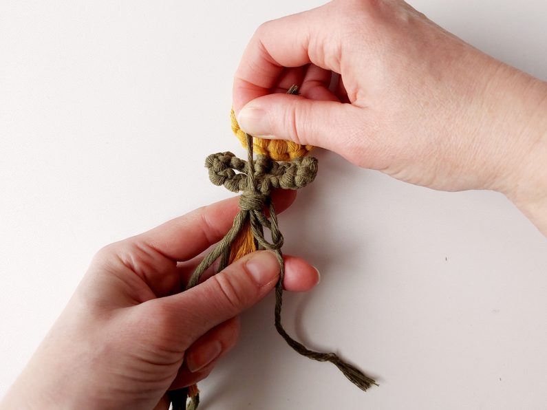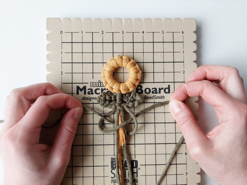 Pro snadnější práci můžeme celou kytičku upevnit do macramé podložky a vytvarovat lístečky. Dvě příze z lístečků a příze, které nám zůstaly z květu, použijeme jako středové příze, kolem kterých budeme plést plochý uzel s přízemi, které nám zůstaly.