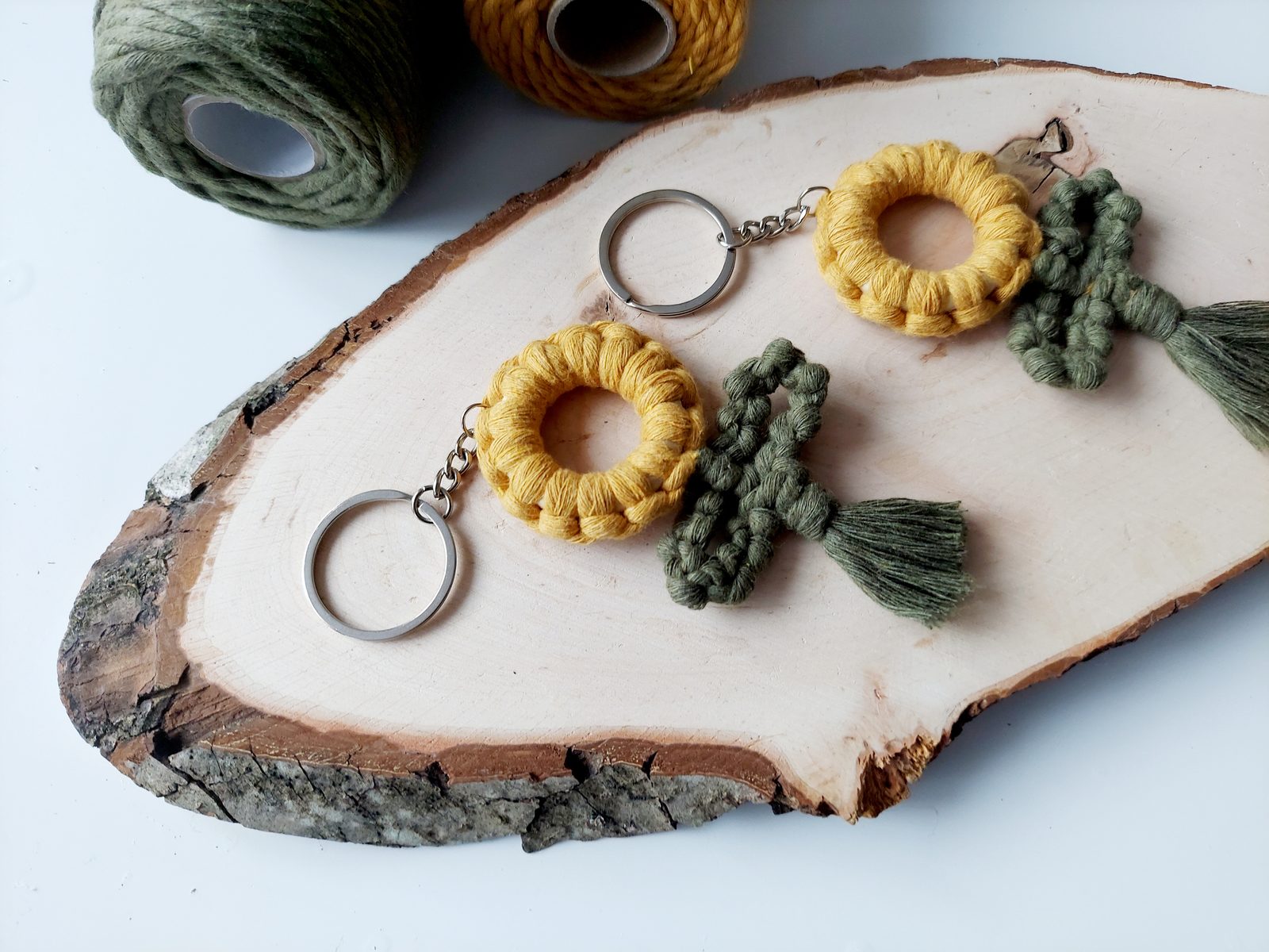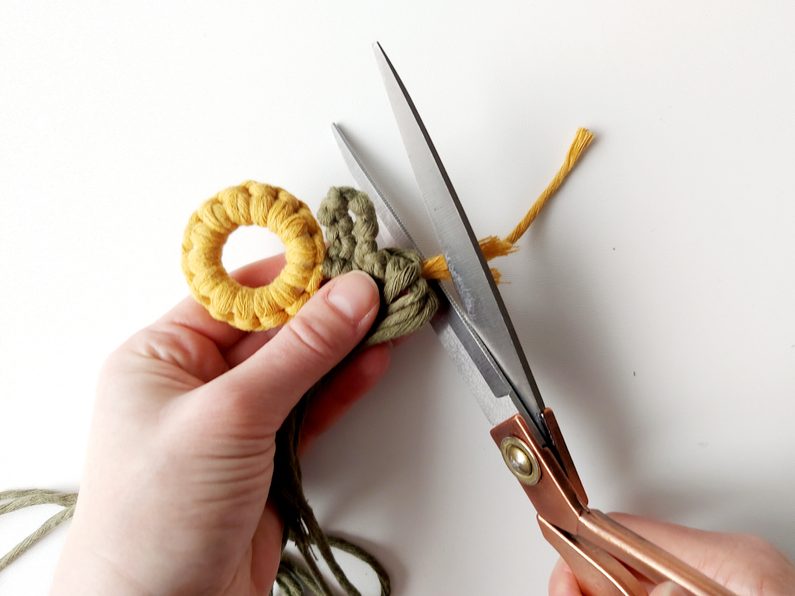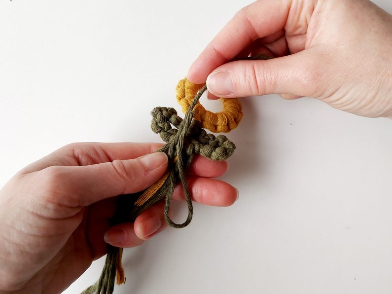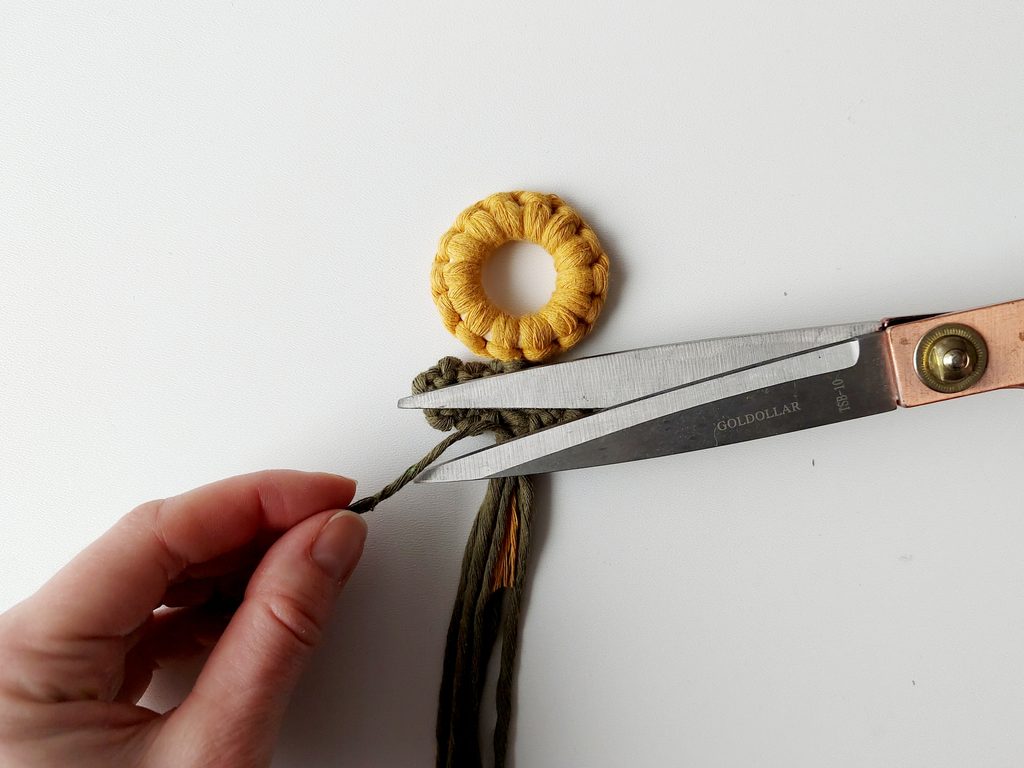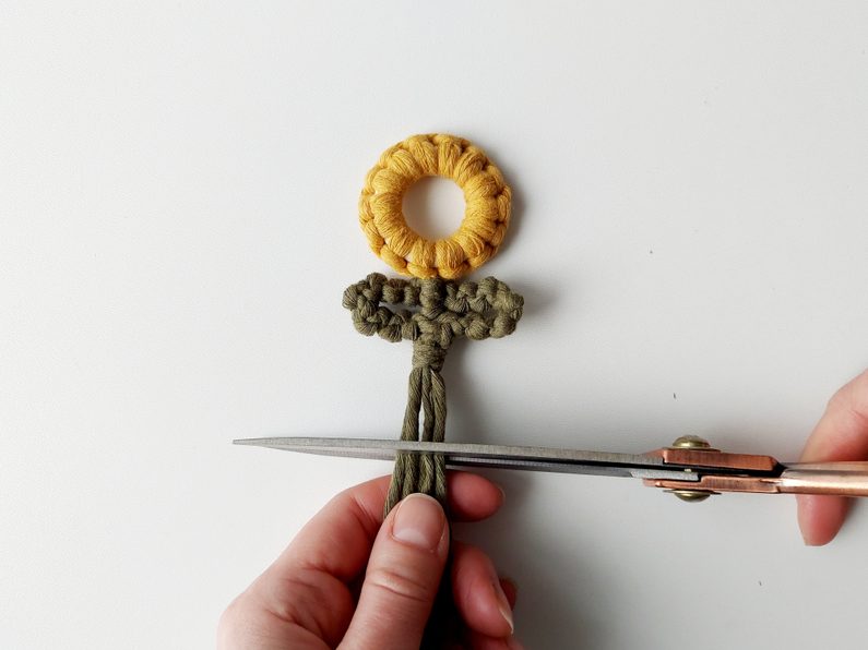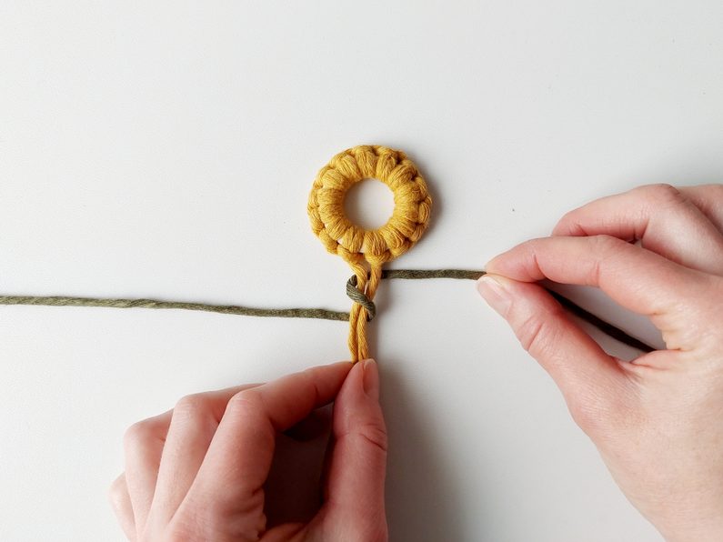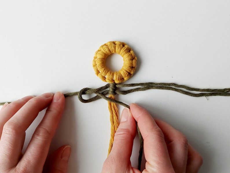 Pro snadnější práci můžeme celou kytičku upevnit do macramé podložky a vytvarovat lístečky. Dvě příze z lístečků a příze, které nám zůstaly z květu, použijeme jako středové příze, kolem kterých budeme plést plochý uzel s přízemi, které nám zůstaly.