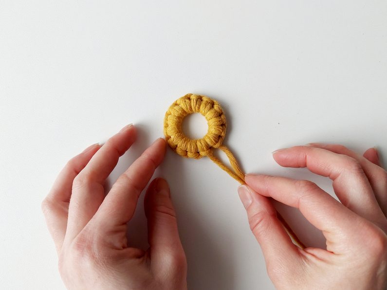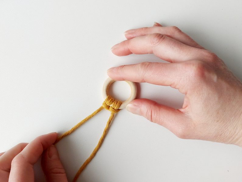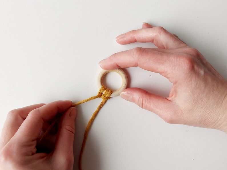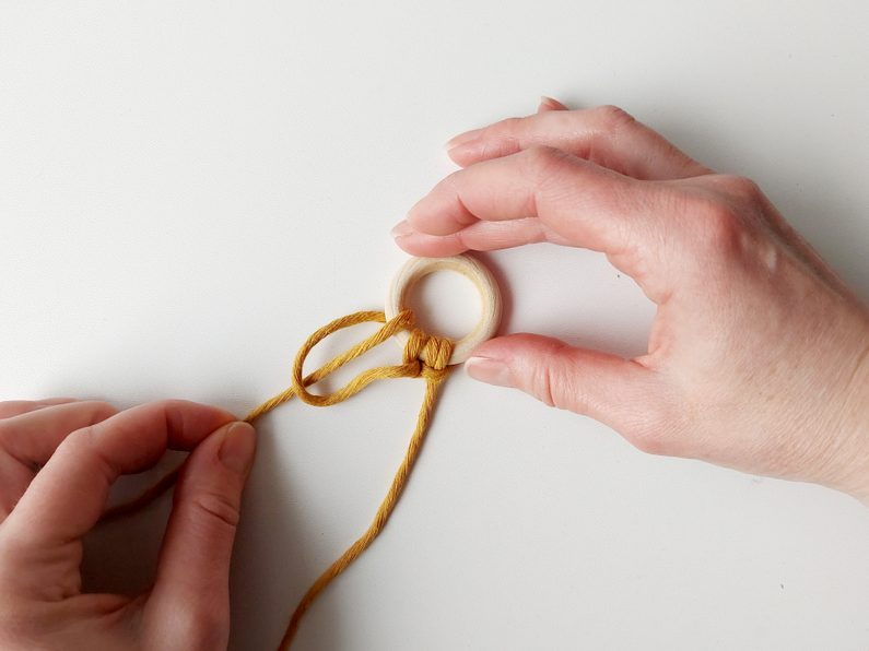 Připravíme si kroužek a 1 kus příze o délce cca 1,4 m. Tu připevníme na kroužek základním upevňovacím uzlem tak, aby jeden z konců měl cca 10 cm.