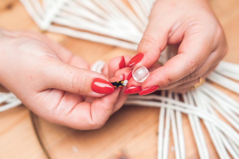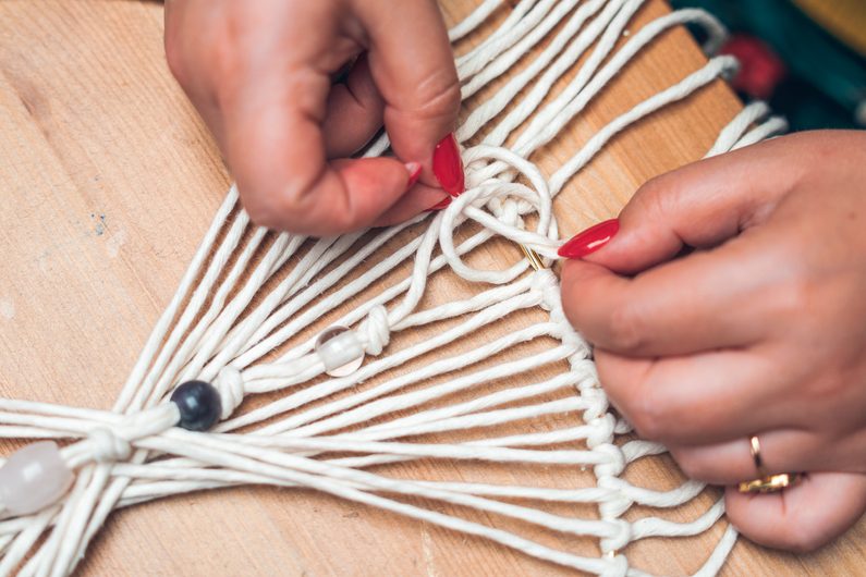 Na středovou přízi navlékneme minerální korálky. Pro snadnější navlékání můžeme konce příze omotat lepící páskou. Pod každým korálkem uděláme uzlík.