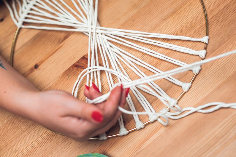 Ke spodní části kruhu připevníme příze opět klasickým uzlíkem.