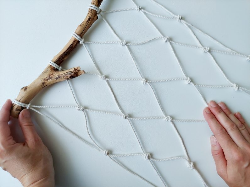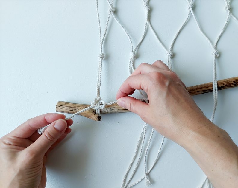 Pokud máme připravenou celou síť, obrátíme si nástěnku zadní stranou nahoru. Spodní klacek připevníme viz obrázky tak, aby nám uzlík vznikl právě na této zadní části.