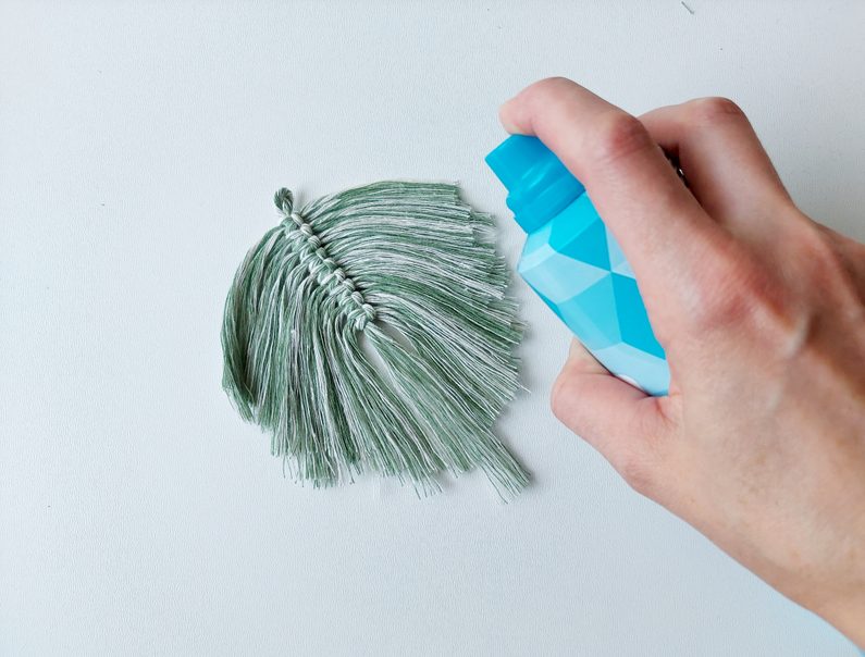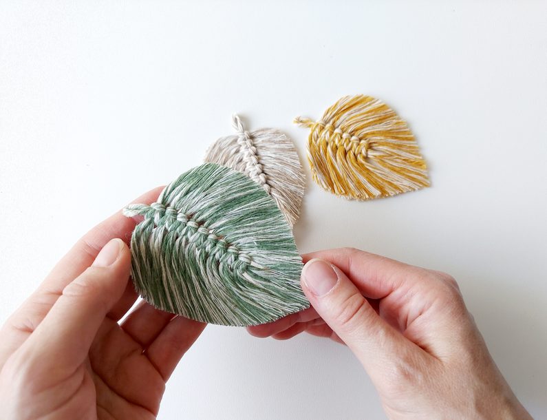 Na lístečky si připravíme macramé přízi, pomocí které tvoříme lístečky viz obrázky. Na středovou přízi vážeme postupně ve dvojici kousky příze do požadované velikosti.Více najdete zde.