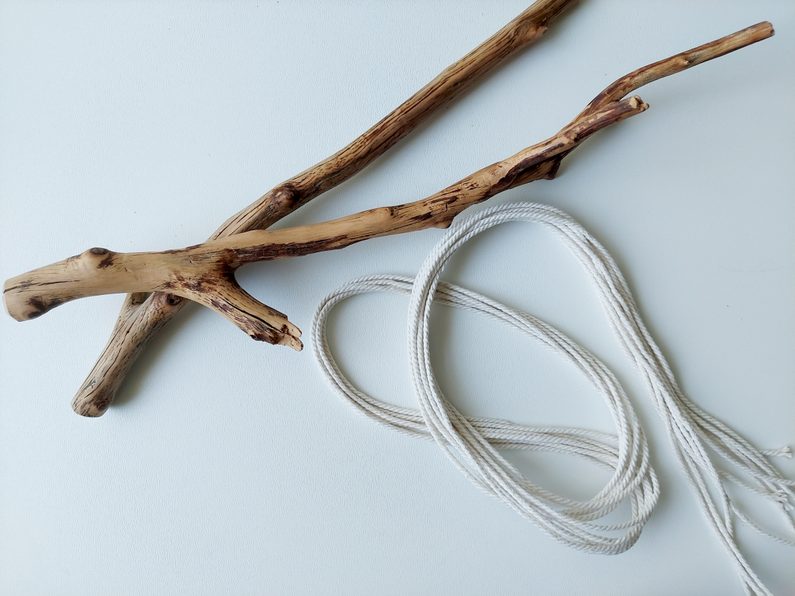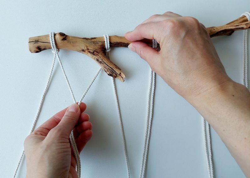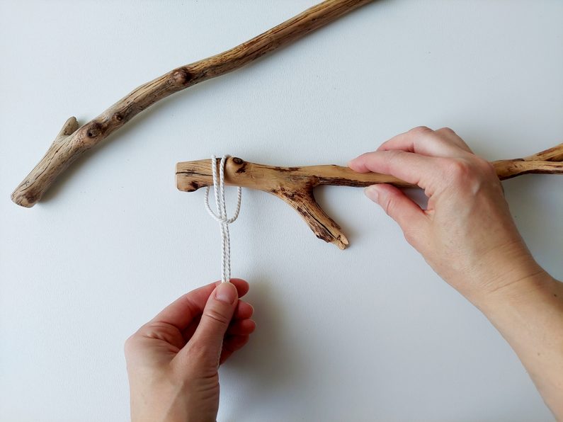 Připravíme si dva očištěné, případně ošetřené lakem nebo mořidlem, klacky/tyče. Na velikost nástěnky o rozměru cca 40 x 40 cm budeme potřebovat 5 kusů příze o délce cca 1,5 m, které základním upevňovacím uzlem připevníme na jeden z klacků.