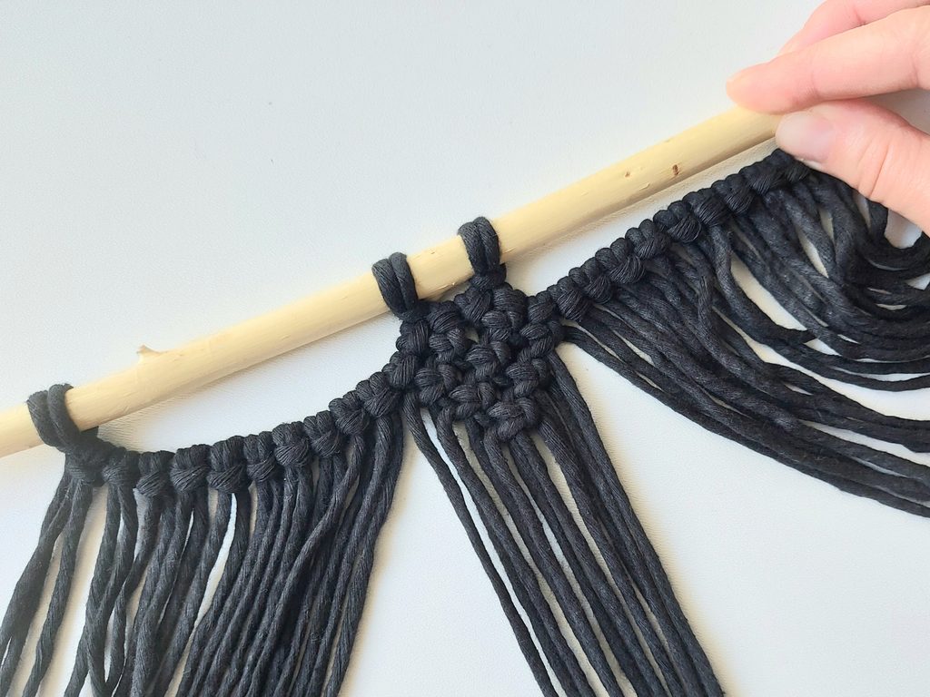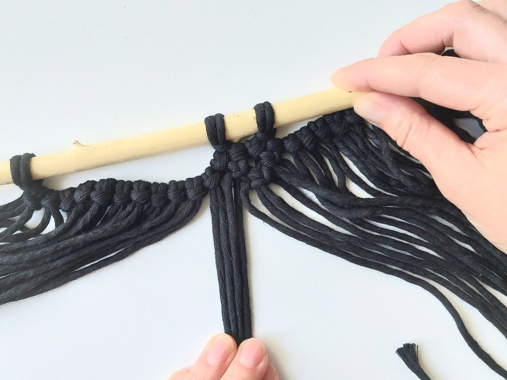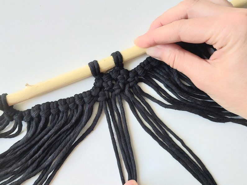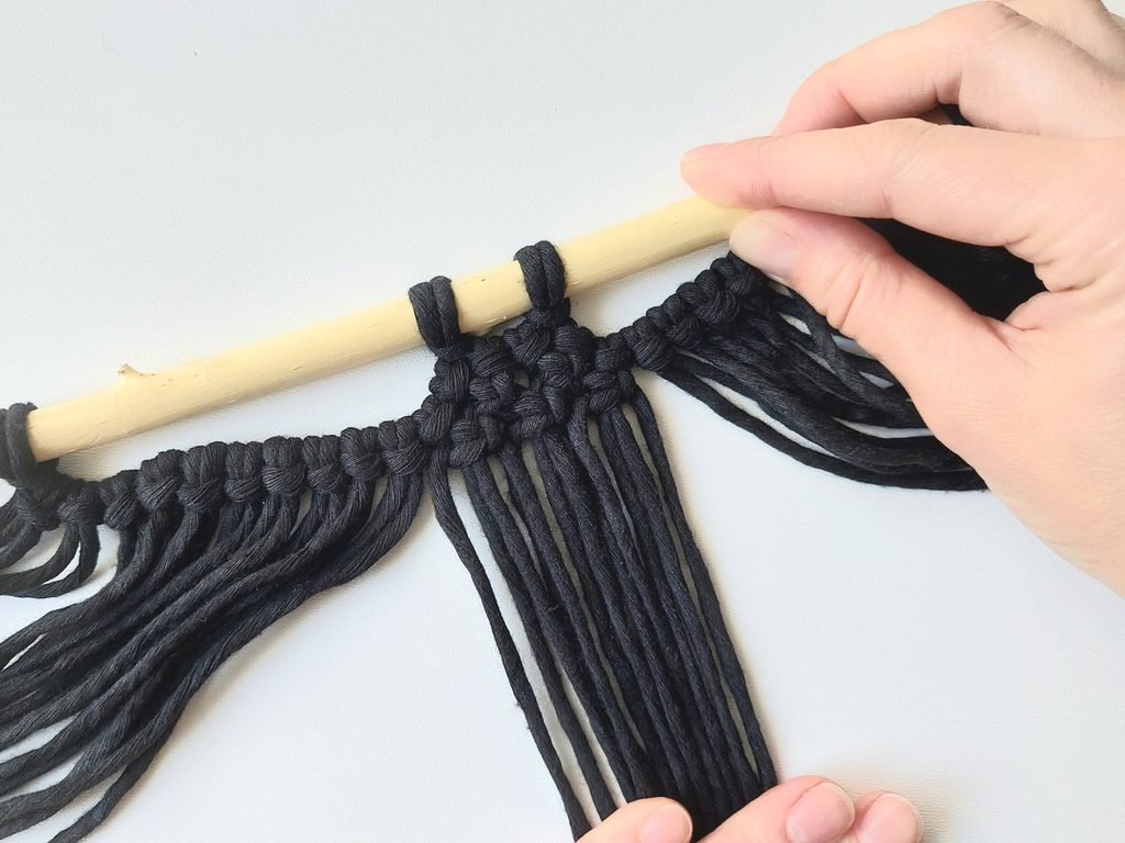 Další řadu tvoříme opět plochým uzlem mezi uzle v řadě předešlé. V této řadě pouze 2 uzle. V poslední řadě již jen 1 uzel.
