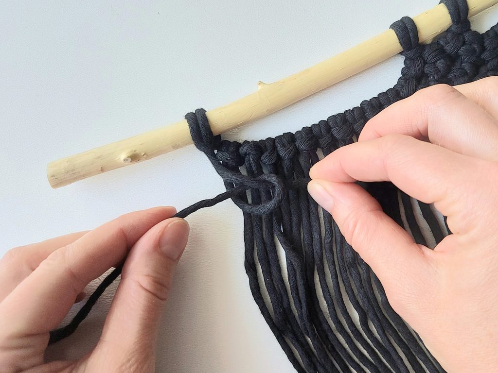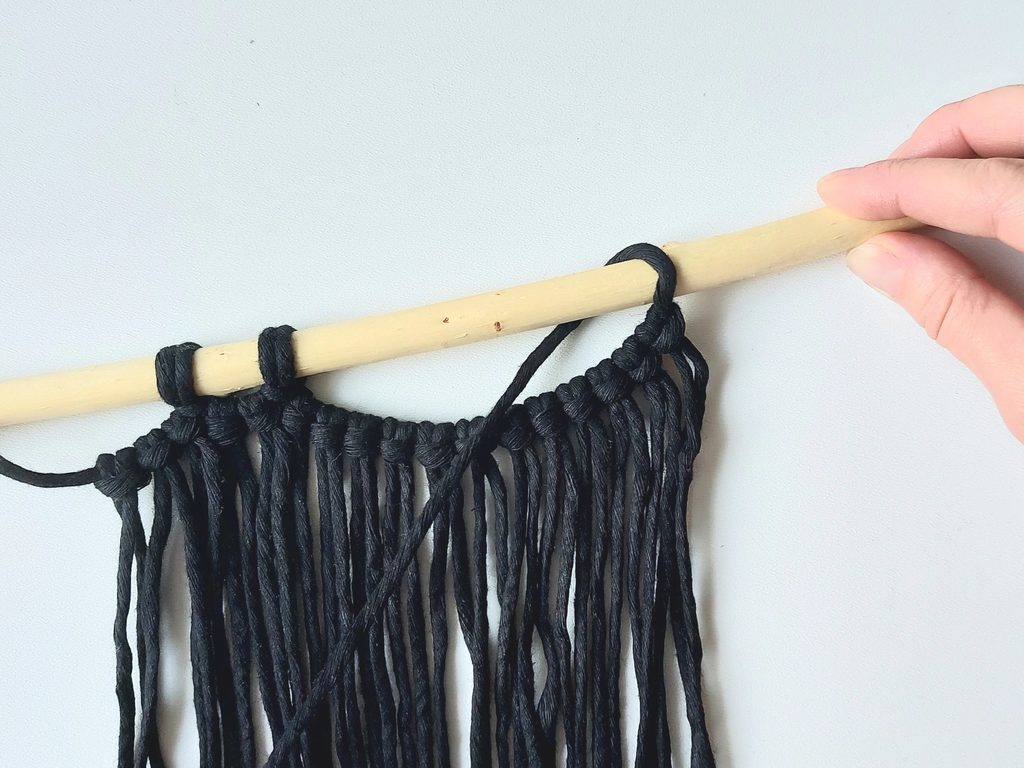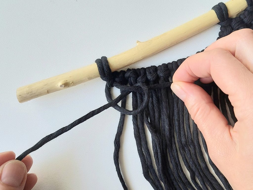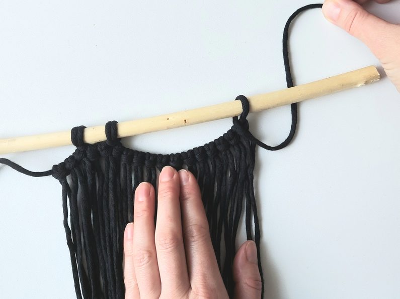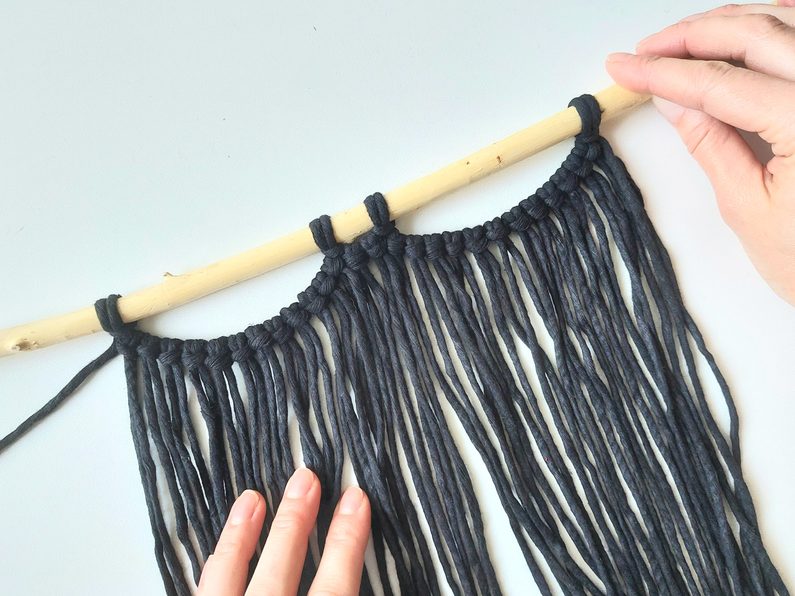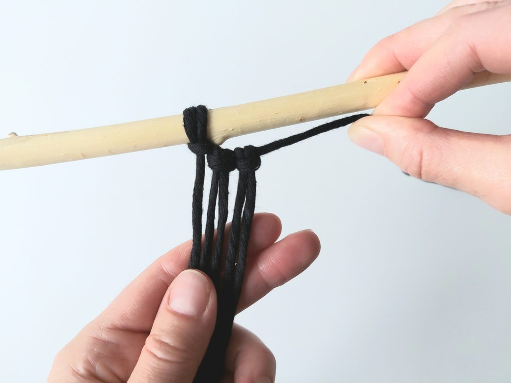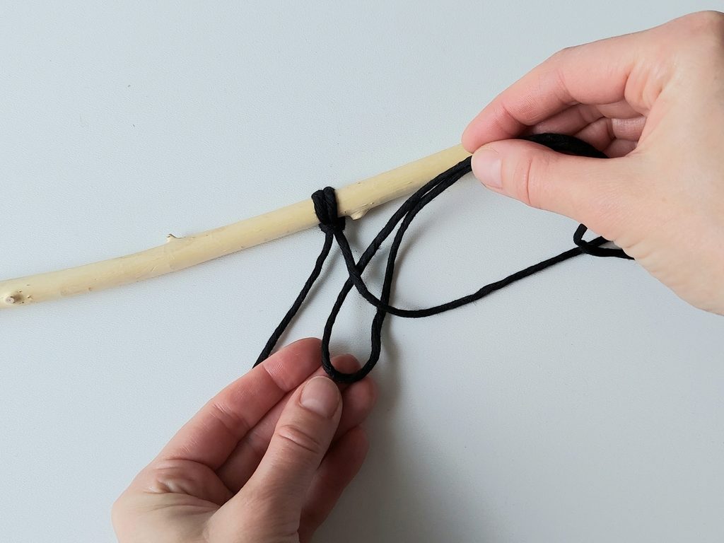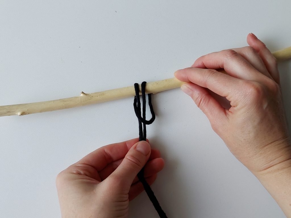 Připravíme si větvičku nebo macramé tyč a jeden kus příze o délce cca 2m (základní/vodící příze), na které si v polovině její délky uděláme očko a základním upevňovacím uzlem připevníme k větvičce.