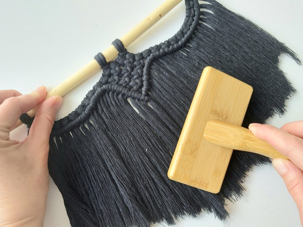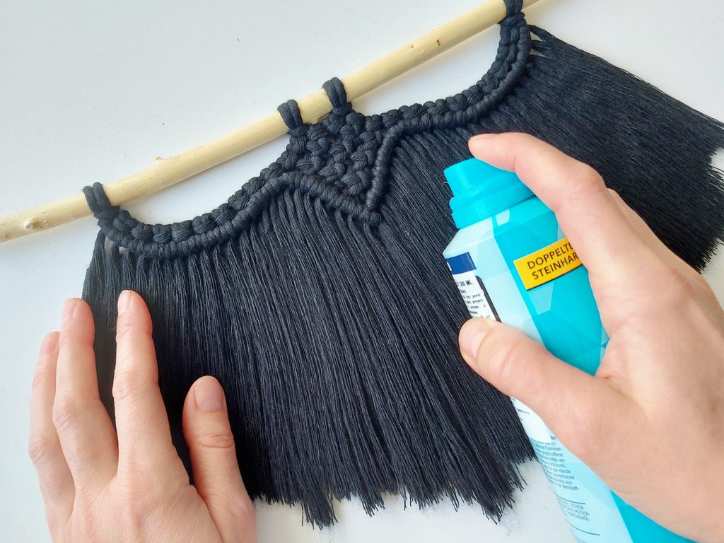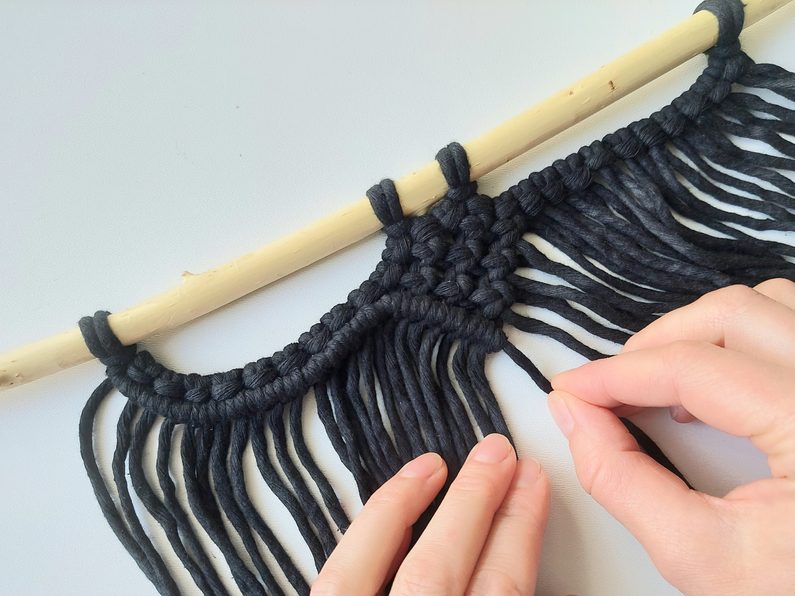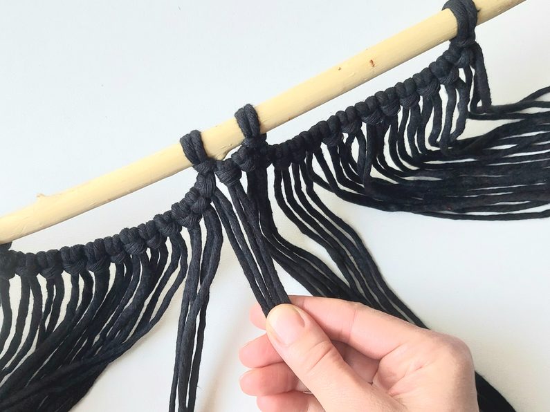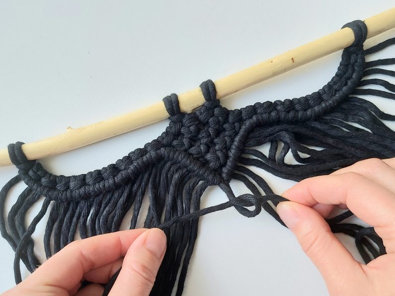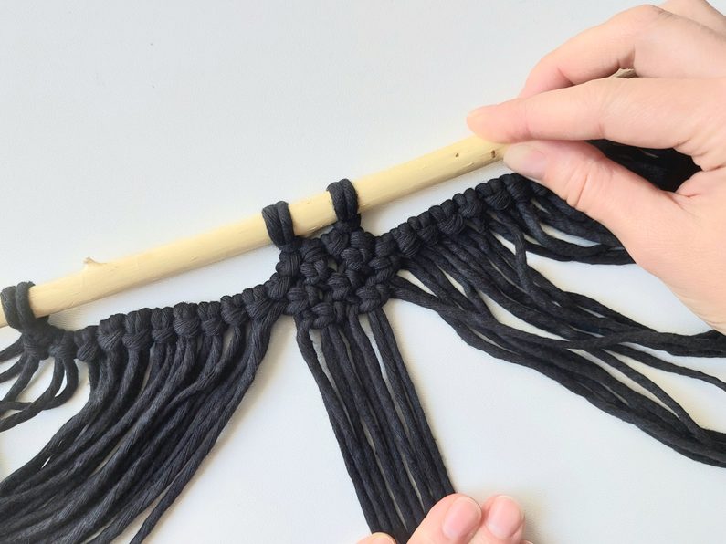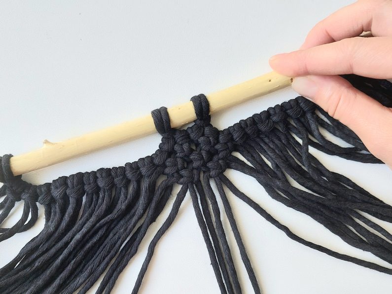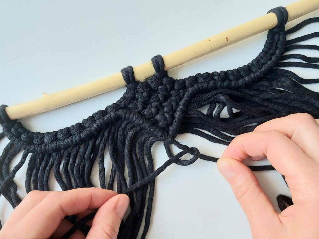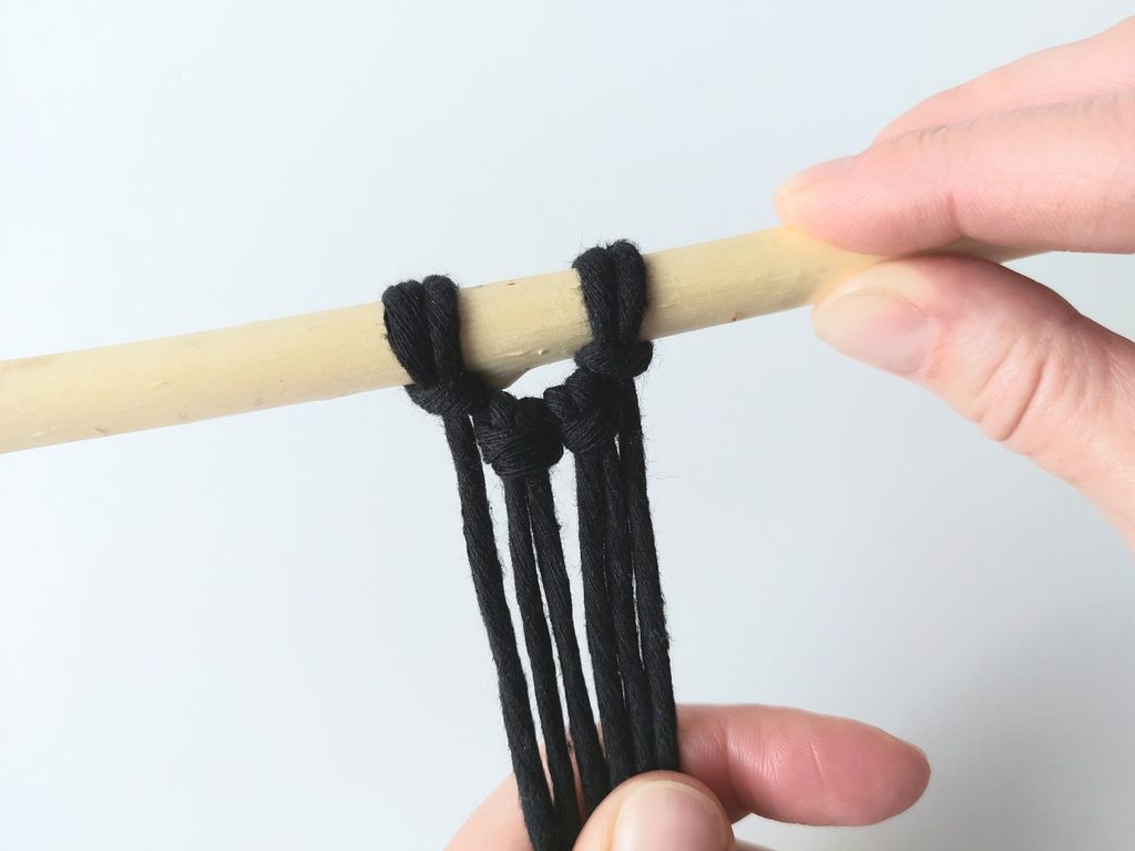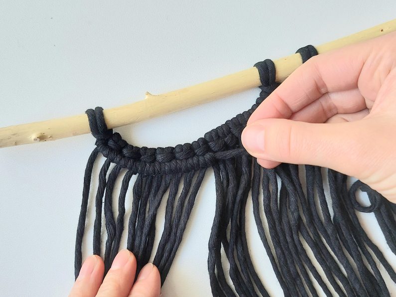 Připravíme si větvičku nebo macramé tyč a jeden kus příze o délce cca 2m (základní/vodící příze), na které si v polovině její délky uděláme očko a základním upevňovacím uzlem připevníme k větvičce.