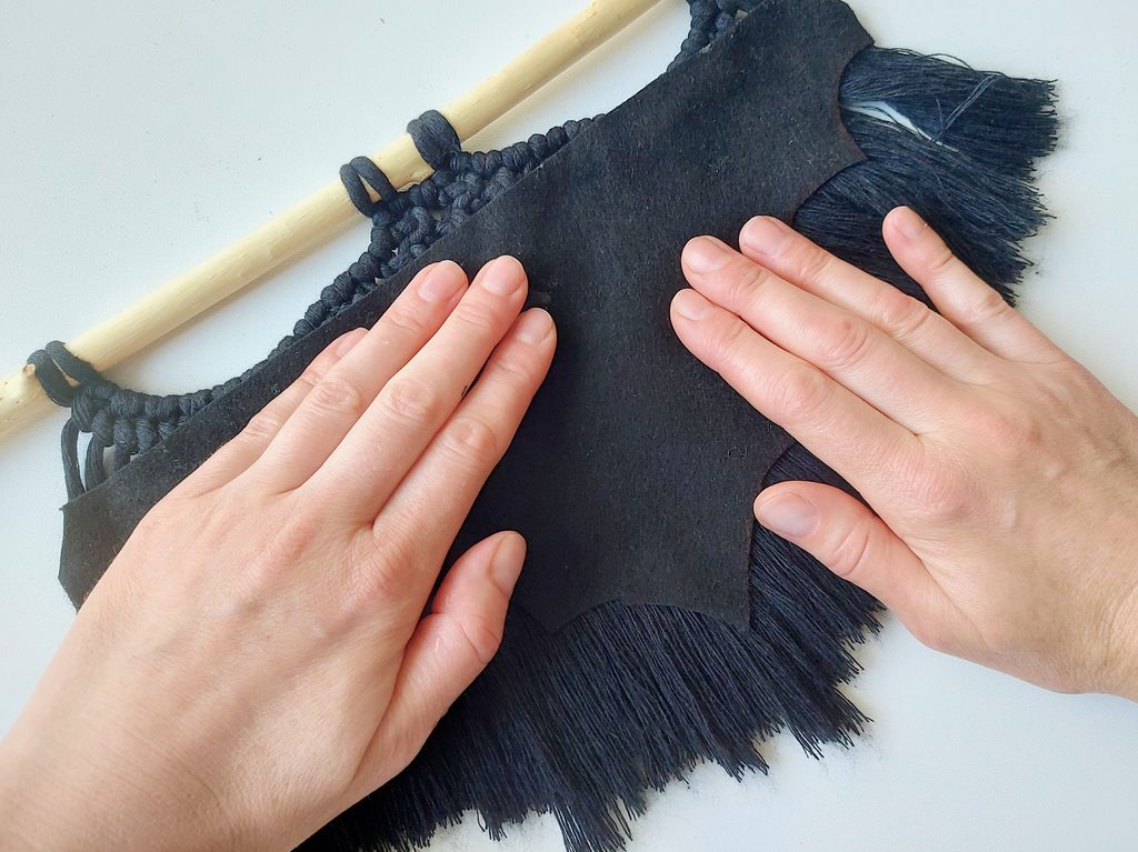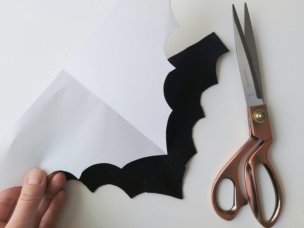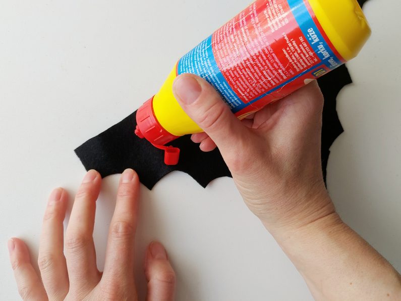 Připravíme si papírovou šablonu tvaru křídel, kterou si obkreslíme na filc a vystřihneme. Filc nalepíme ze zadní části netopýra a přitiskneme. Z přední části zafixujeme lakem na vlasy. Po zaschnutí laku vystřihneme tvar křídel podél filcu.