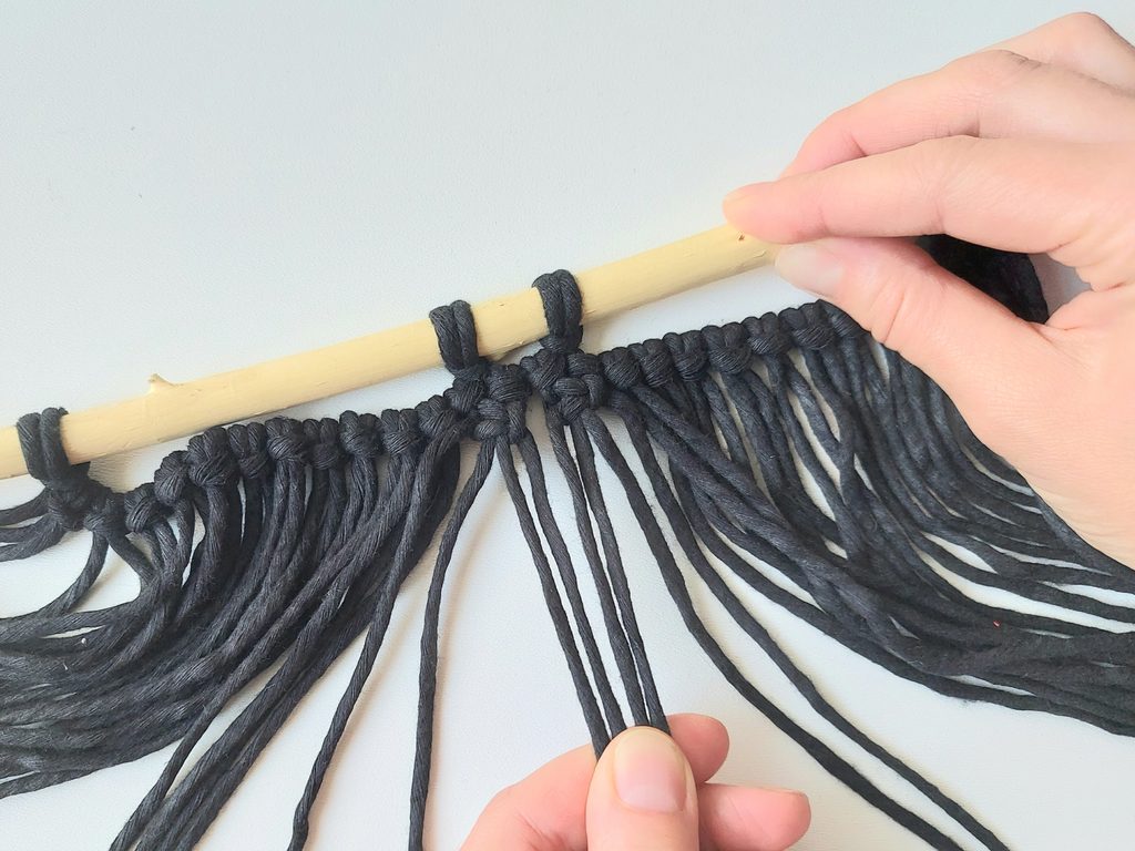 Připravíme si 6 kusů příze o délce 70cm a základním upevňovacím uzlem připevníme od středu na každou stranu 3 příze. Následně na každou stranu (křídlo) připevníme dalších cca 9 přízí o délce 50cm. Mezi jednotlivými přízemi necháme cca 3mm místa. Konec vodící příze připevníme k tyčce stejně jako v kroku 3.