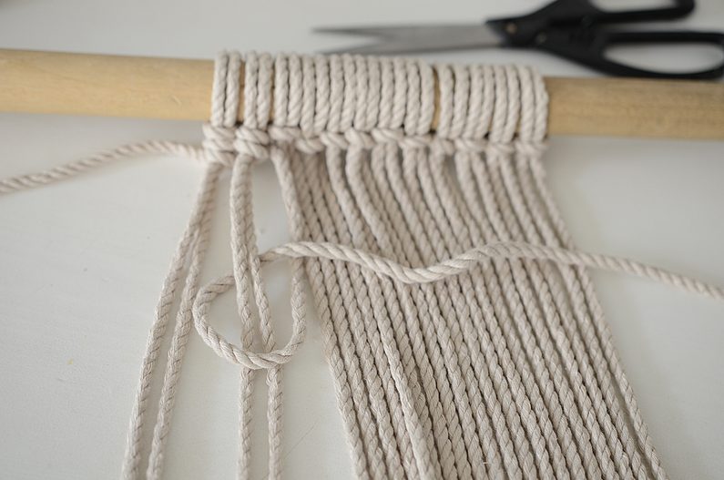 řad. Šňůry přeložte na polovinu a podle návodu navažte na tyč.