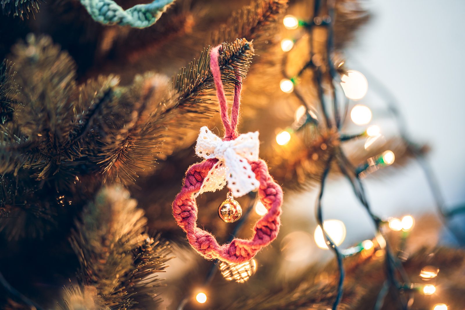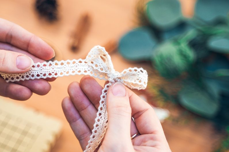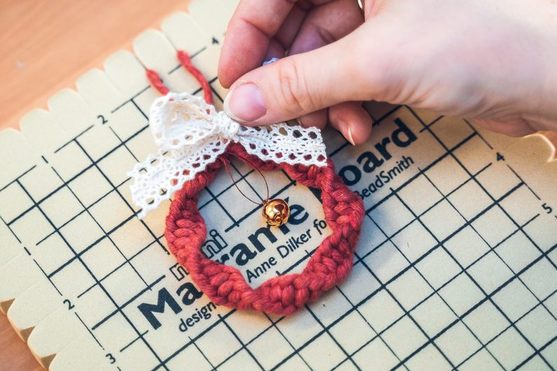 Na nit navlékneme rolničku a přišijeme. Z krajkové stuhy vytvoříme mašličku, kterou pomocí tavné pistole přilepíme.