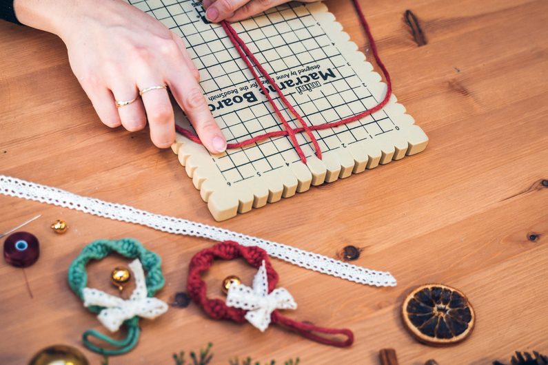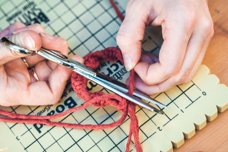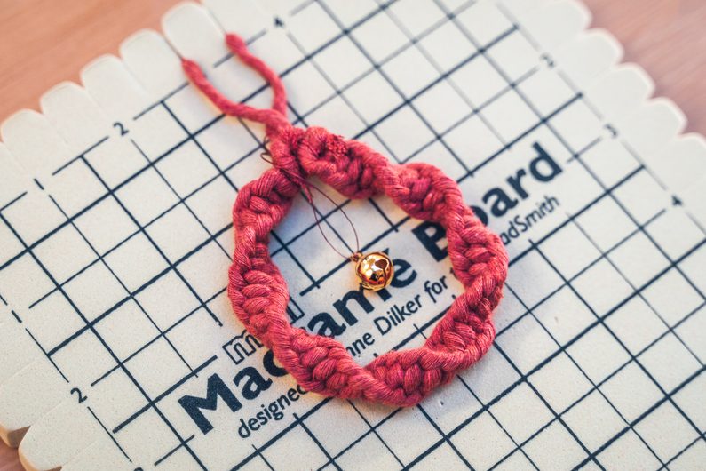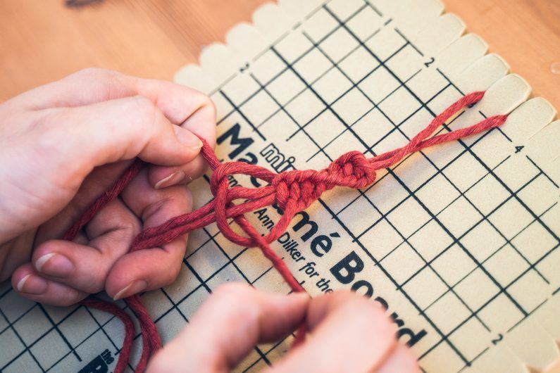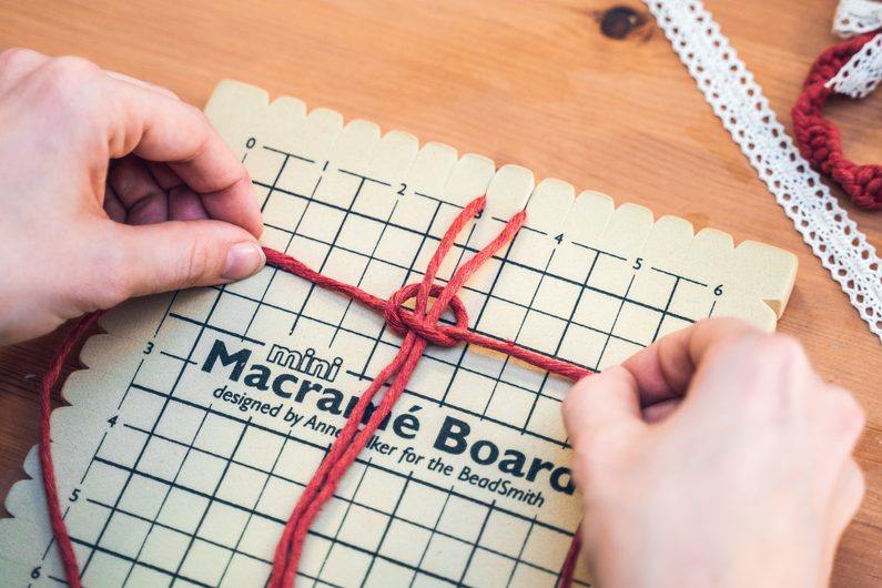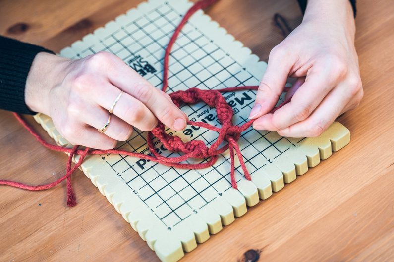 Připravíme si provázek o délce 70cm a provázek o 150cm. Kratší šňůrku si připevníme na Macramé board. Dělší provázek vložíme v polovině dospod vodící šňůry. Levý provázek přehodíme přes prostřední a pravý přeložte přes levý. Pravou šňůrku provlečeme spodem skrz smyčku, která vznikla mezi levým a prostředním provázkem a utáhneme. Stejným způsobem pokračujeme pořád dokola. Postupně se zapletené provázky začnou vlnit do spirály.
