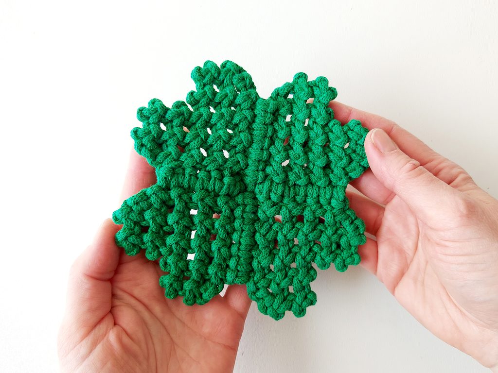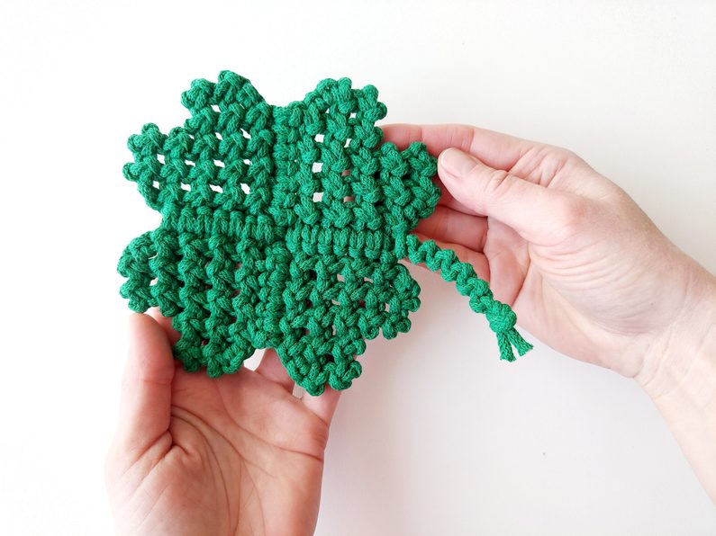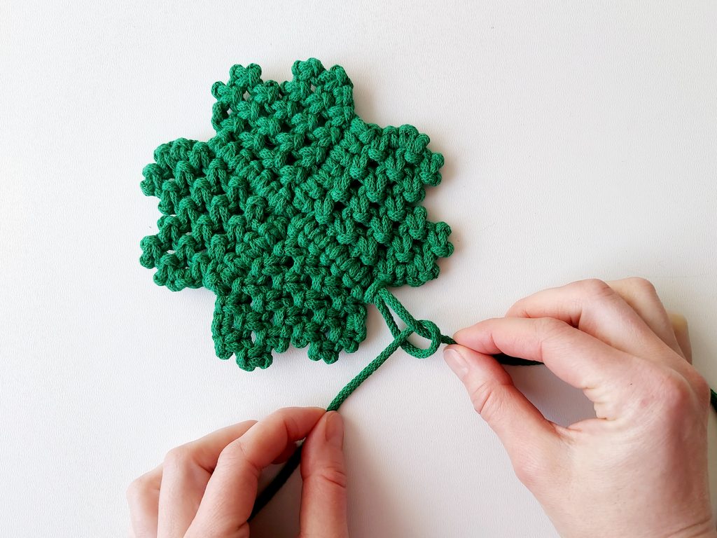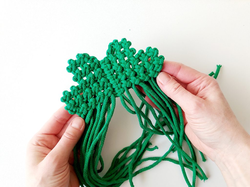 • Jednotlivá srdíčka spojíme opět plochým uzlem, pouze středové příze, kolem kterých uzel pleteme, nám zůstanou po celou dobu spojování stejné. Uzlíky kolem těchto středových přízí pleteme s každou dvojící přízí ze srdíčka.