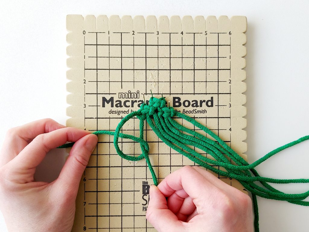 • K upletenému uzlu přidáme z každé strany jednu přízi, kterou v její polovině připevníme na podložku a pleteme opět plochý uzel viz obrázky.