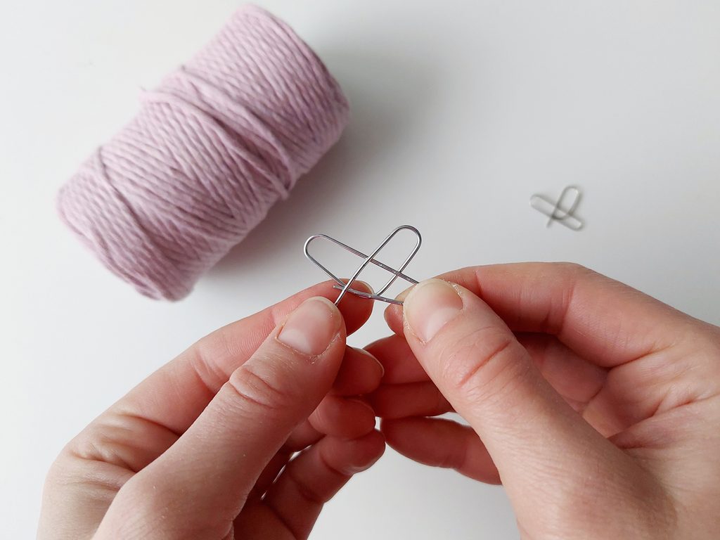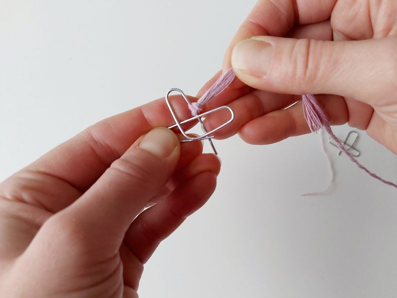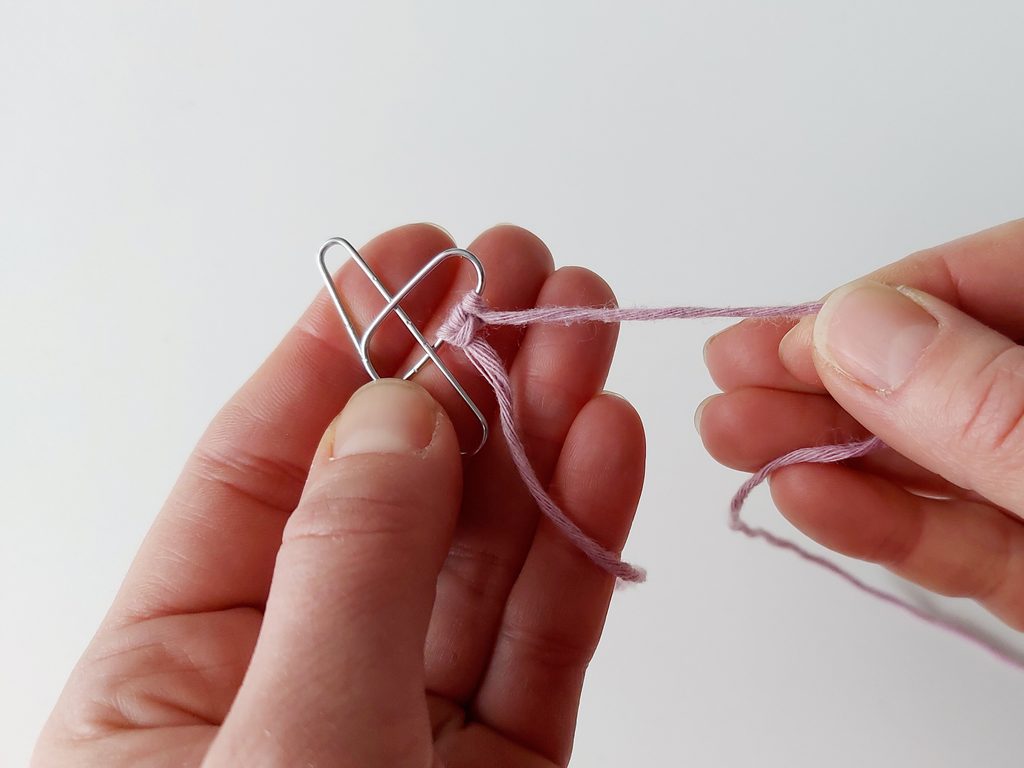 Základním upevňovacím uzlem připevníme přízi ke sponce tak, aby jeden