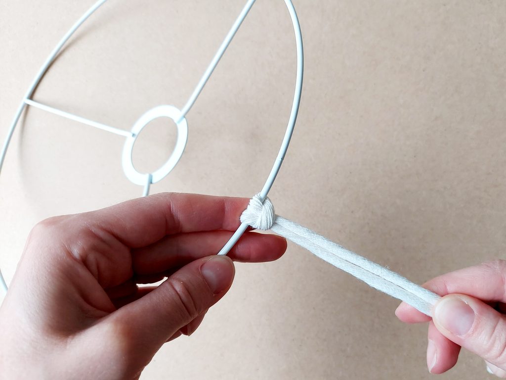 Připravíme si 68 kusů příze o délce 135 cm. Jednotlivé příze připevníme k základu stínidla základním upevňovacím uzlem.