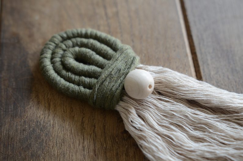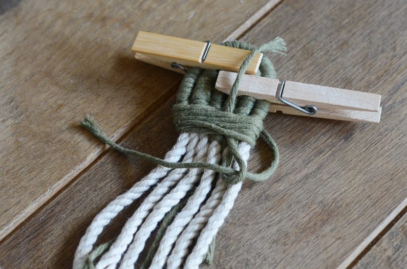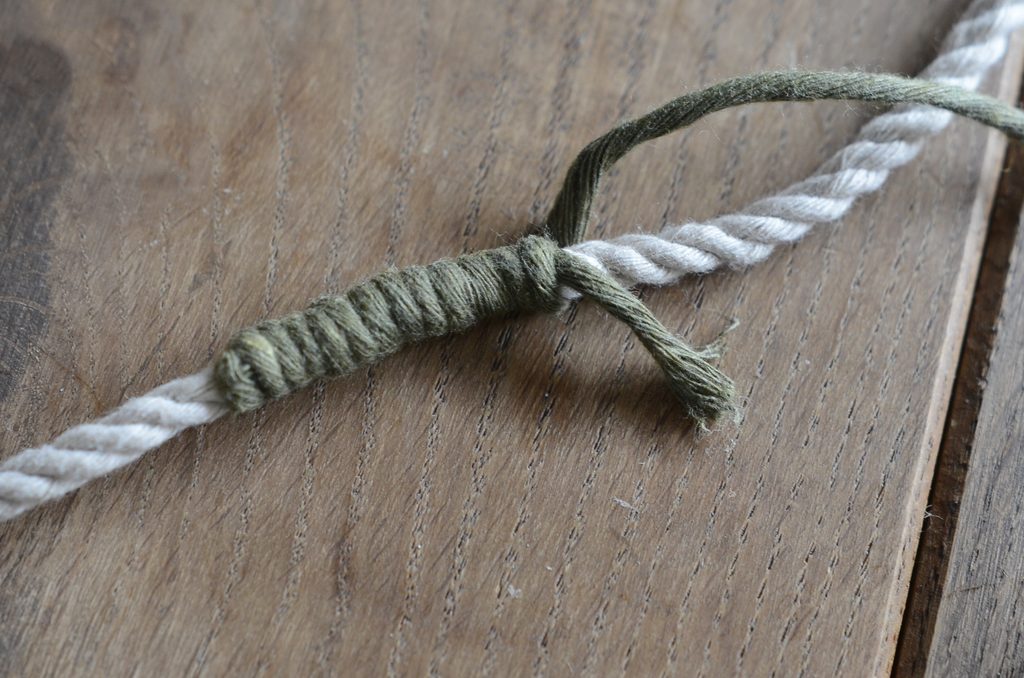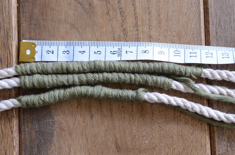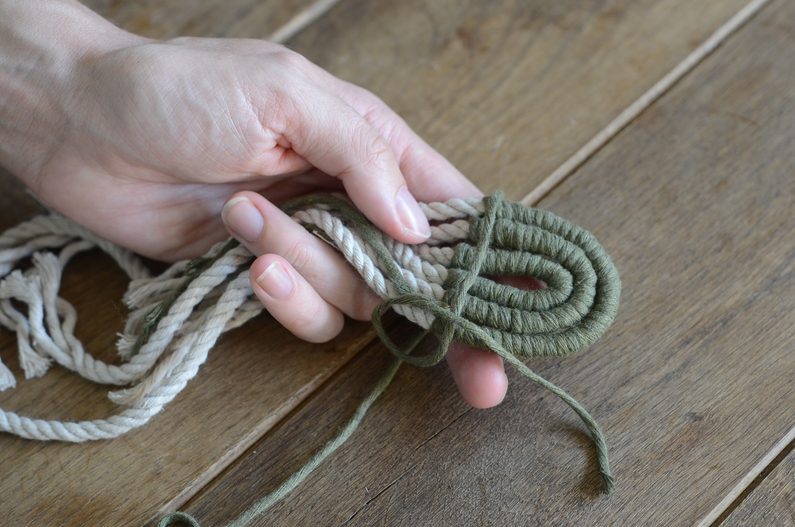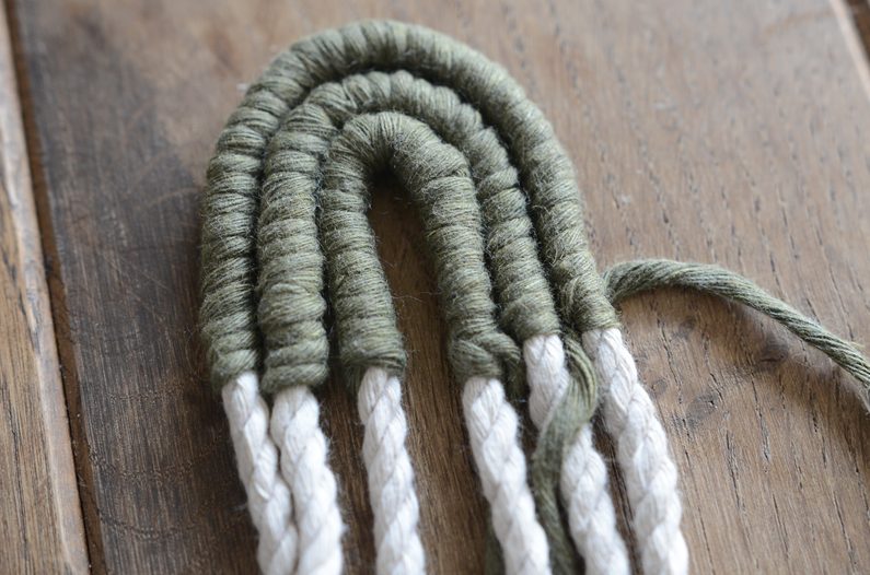 pevně začněte silné přírodní šnůry omotávat, abyste část smyčky zelené příze