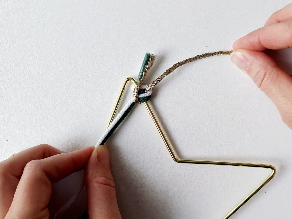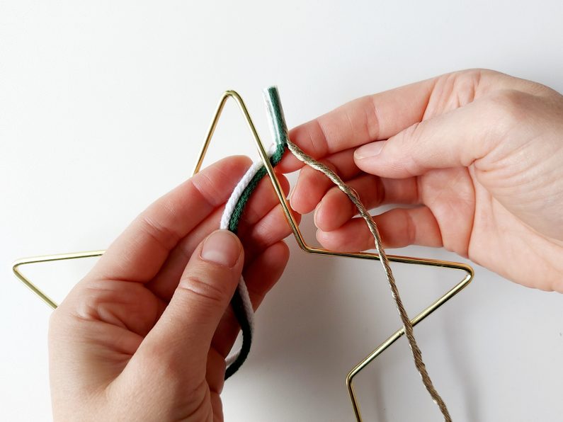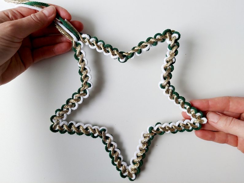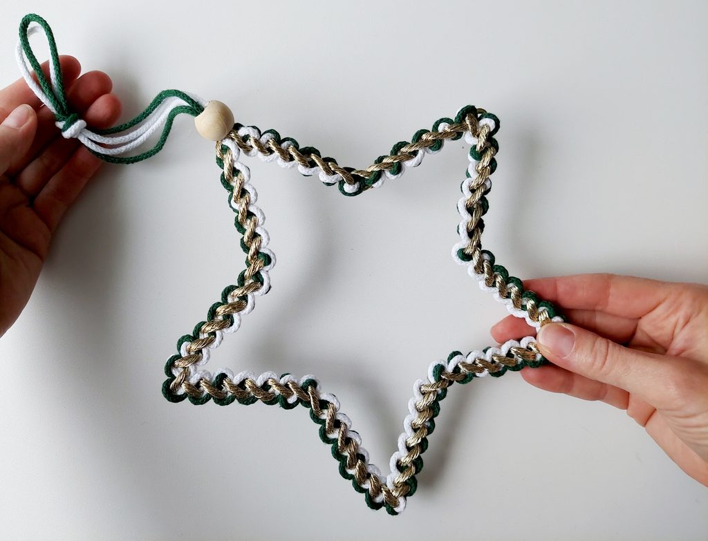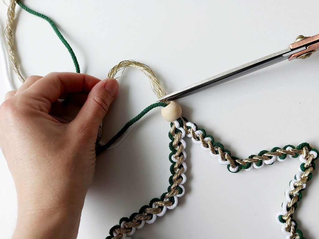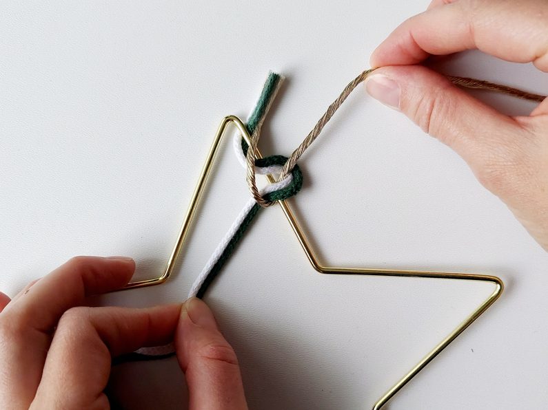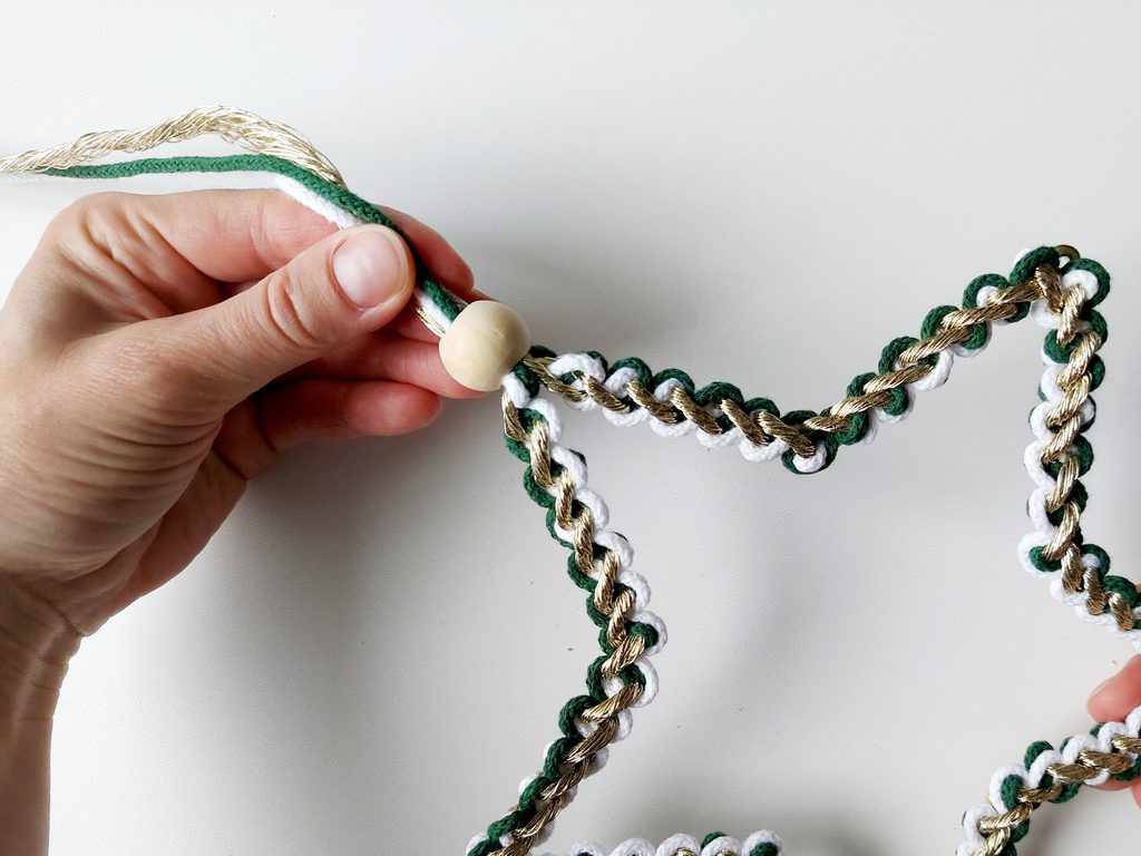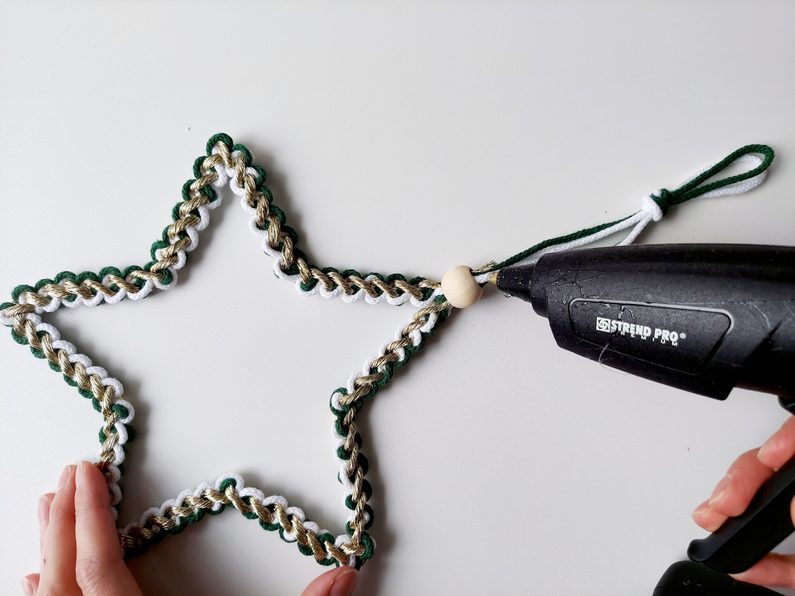 Na příze navlékneme korálek, ustřihneme zlatou přízi, kdy její konec bude schovaný uvnitř korálku. Vytvoříme očko na zavěšení hvězdy klasickým uzlíkem a konce schováme opět do korálku a přilepíme tavnou pistolí. Všechny konce tak budou schované.