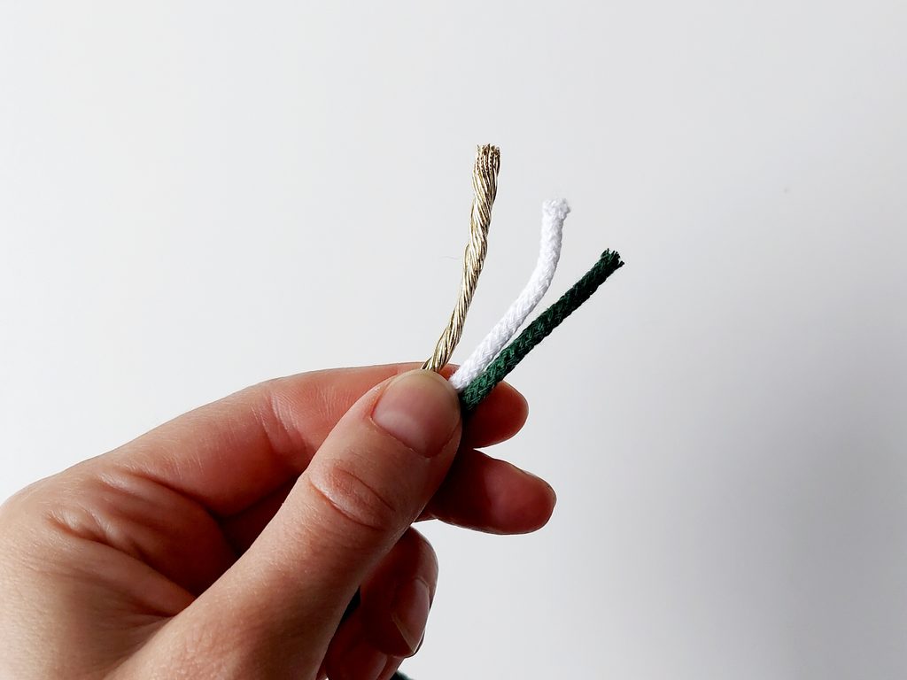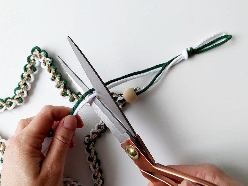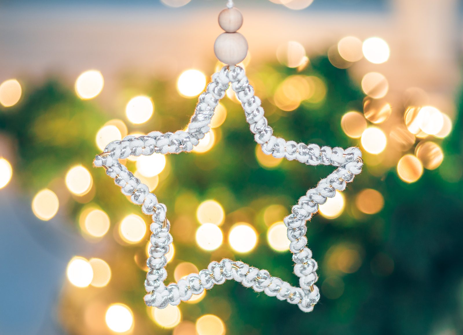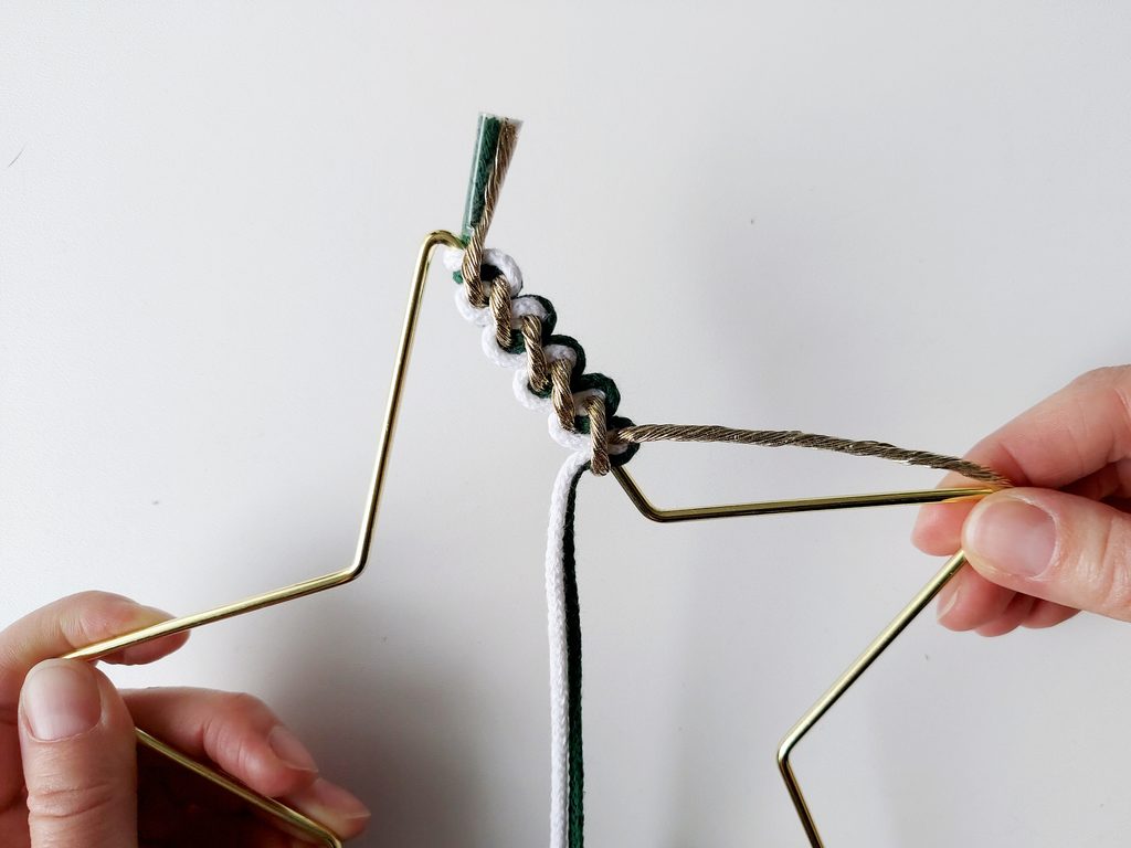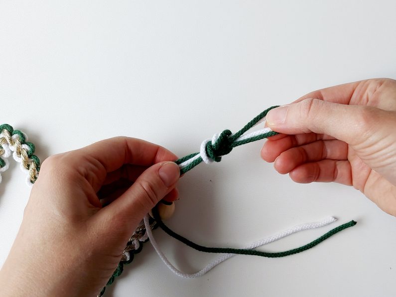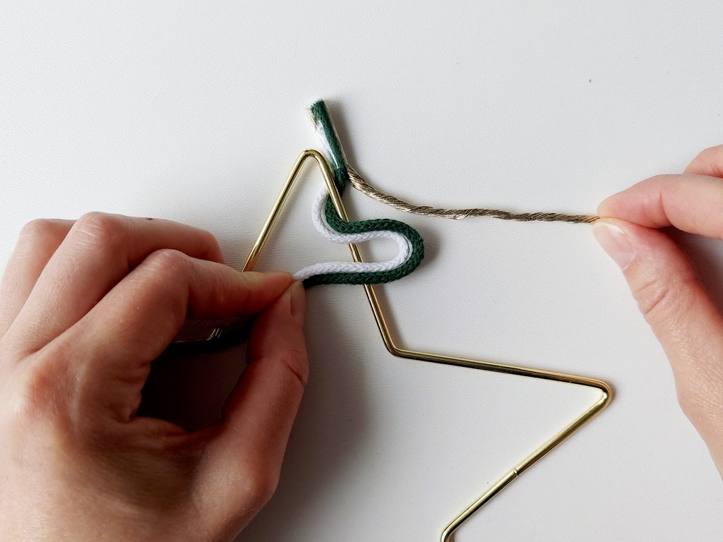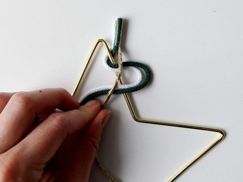 Na příze navlékneme korálek, ustřihneme zlatou přízi, kdy její konec bude schovaný uvnitř korálku. Vytvoříme očko na zavěšení hvězdy klasickým uzlíkem a konce schováme opět do korálku a přilepíme tavnou pistolí. Všechny konce tak budou schované.