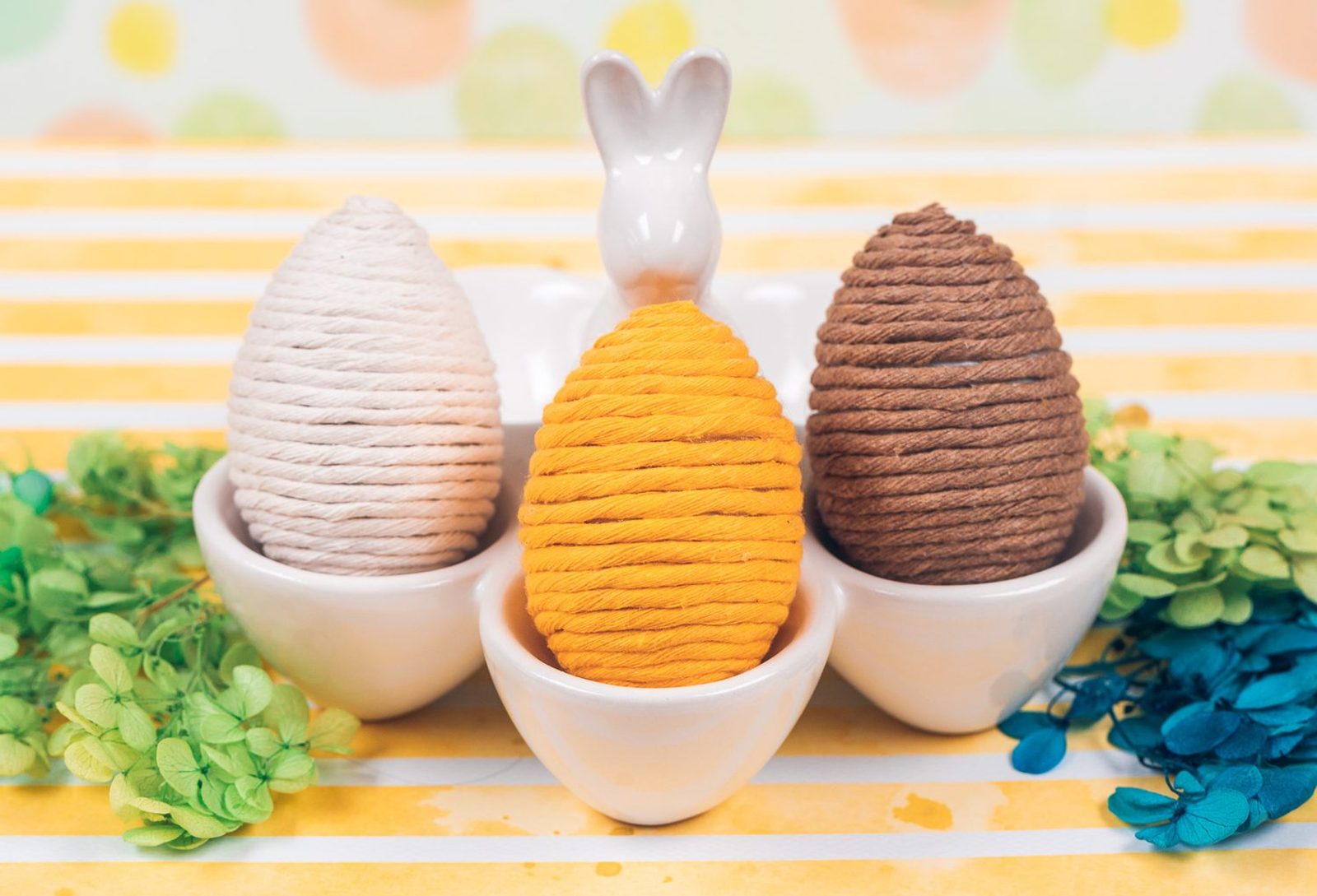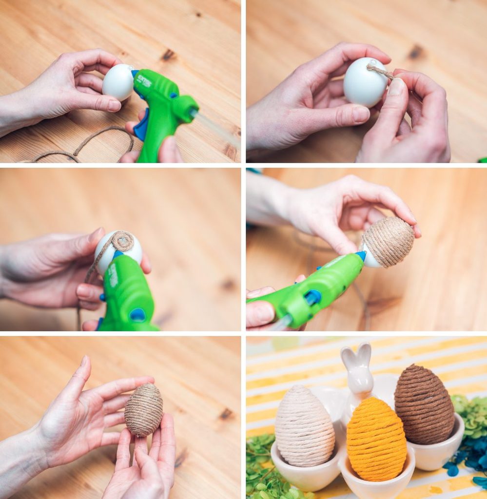 Nahřejeme si tavnou pistoli. Uděláme si malou tečku lepidlem na vrch vajíčka, abychom si uchytili konec macramé příze. Poté postupně lepíme přízi dokola.