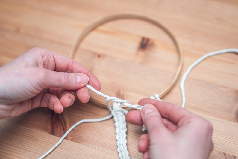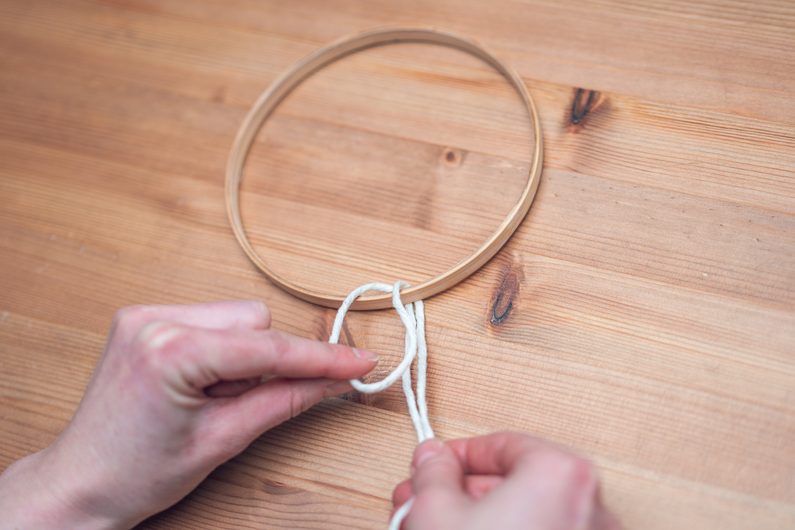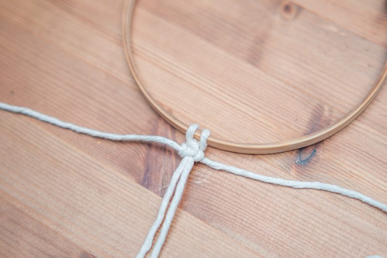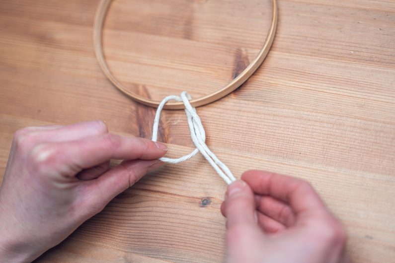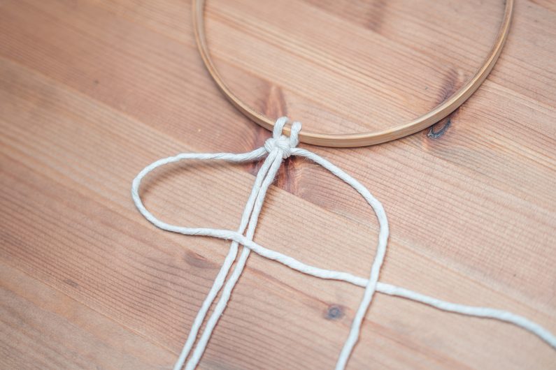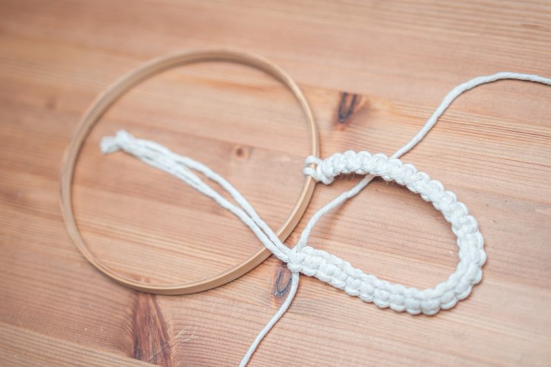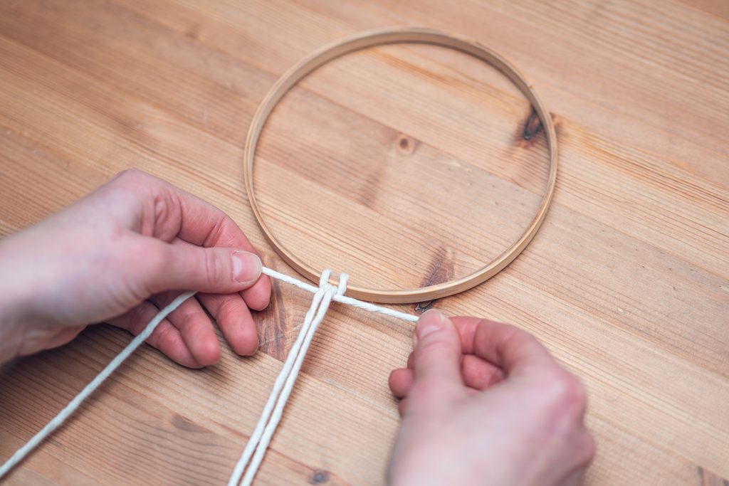 Na jedno ouško si připravíme 90 cm a 4 m dlouhou přízi. 90 cm dlouhou přízi upevníme k menšímu kruhu základním upevňovacím uzlem. Tento kousek příze nám poslouží jako střed, kolem kterého budeme dále ouško plést tzv. plochým uzlem.