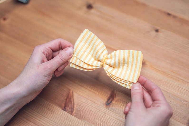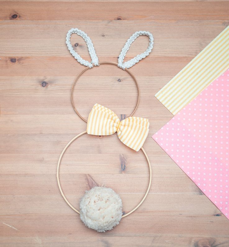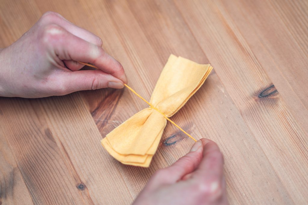 Z dekorativního filcu si vystřihneme 4 stejně veliké kousky na mašli a svážeme provázkem. Následně nalepíme na spoj dvou kruhů