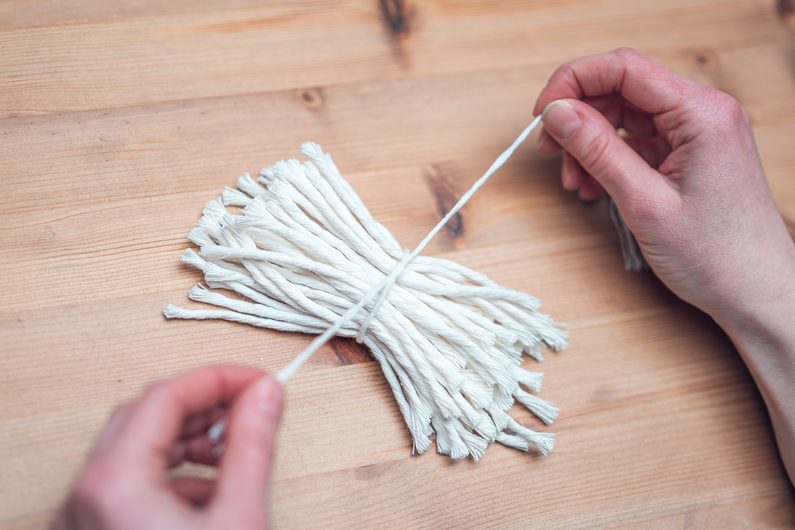 Na ocásek si připravíme cca 40 – 60 kusů 12 cm dlouhé příze, které v polovině pevně svážeme, aby vznikla bambulka