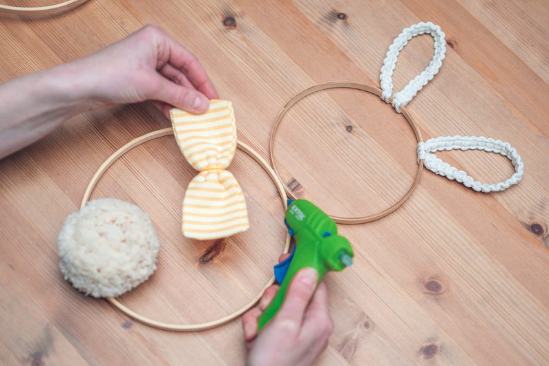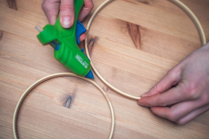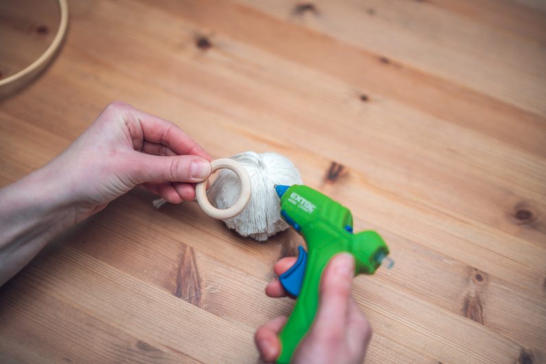 Dřevěný kroužek pomocí tavné pistole připevníme ze spodní části ocásku a následně přilepíme přímo k dřevěnému kruhu