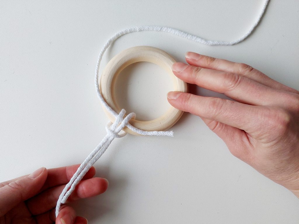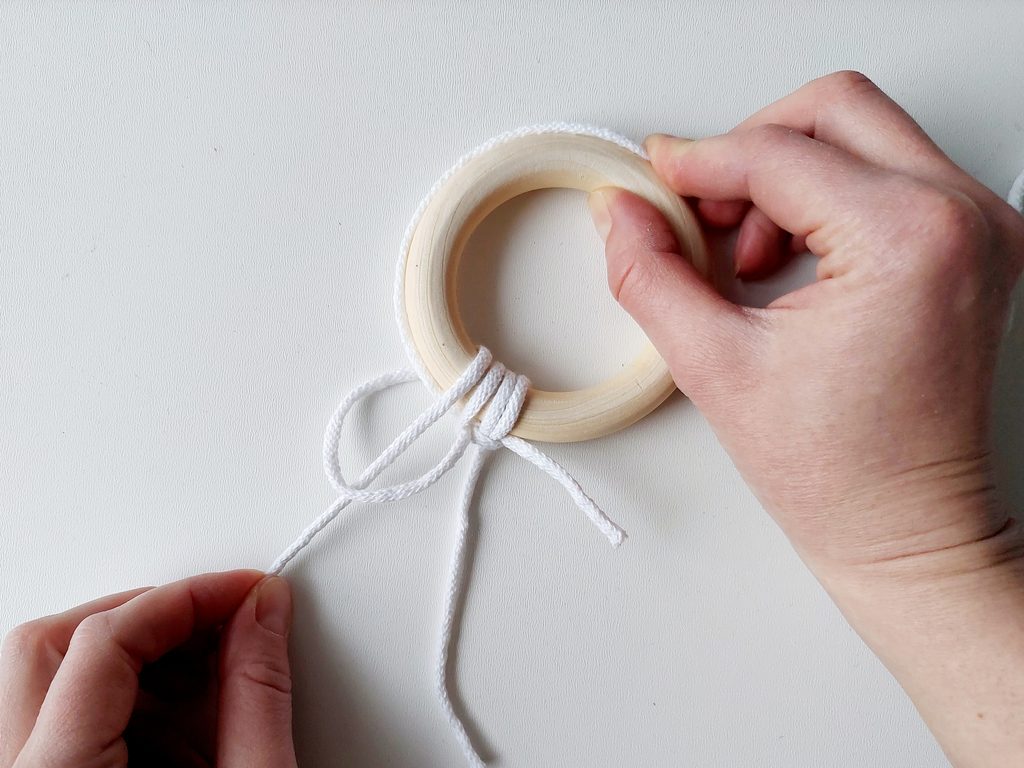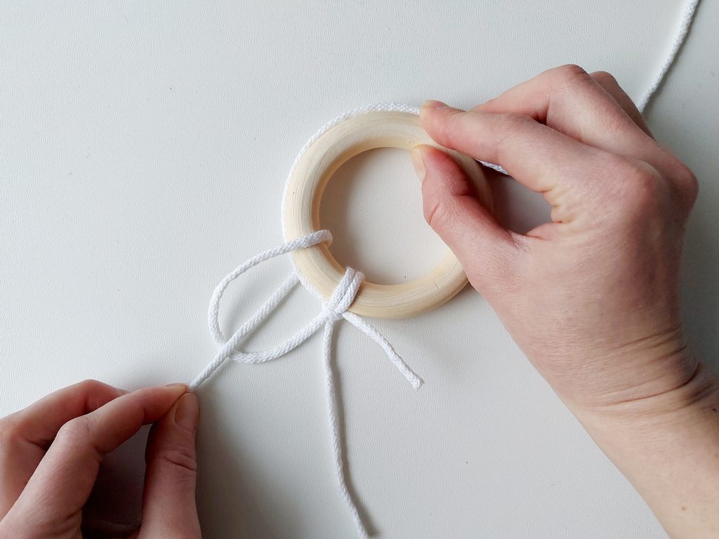 Připravíme si kroužek a 2 příze o délce 1 a 6 m. Kratší přízí budeme kopírovat tvar kroužku a delší přízi upevníme základním upevňovacím uzlem ke kroužku tak, aby jeden z konců měl cca 10 cm.