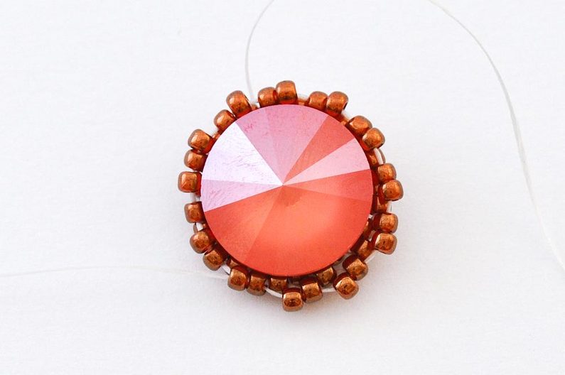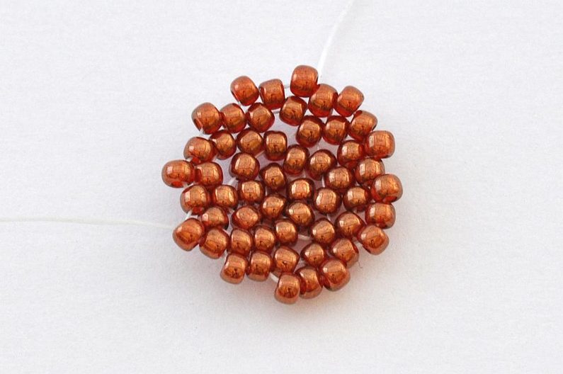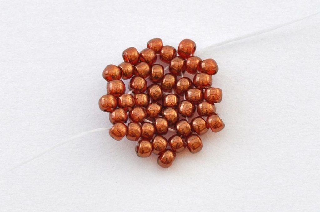 Pro dokončení kalíšku použijeme korálky TDR11. Protože jsou užší, jejich přidáváním se obvod kalíšku utáhne a SWRIV14 v něm nakonec bude pevně držet. Šijeme dvanáctou řadu, kde mezi každými dvěma TR11 přidáváme po jednom TDR11. Nezapomeňte hodně utahovat, aby SWRIV14 v kalíšku pevně držela.
