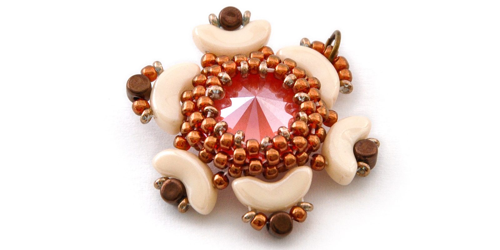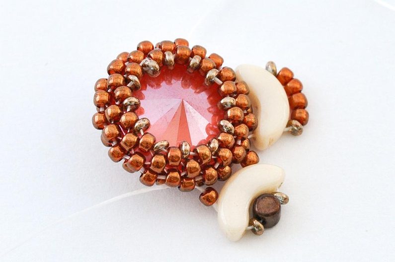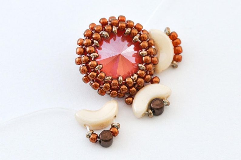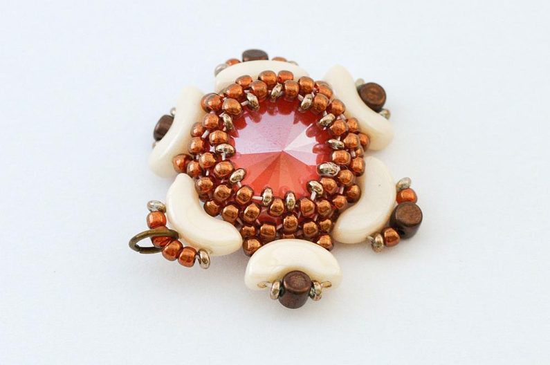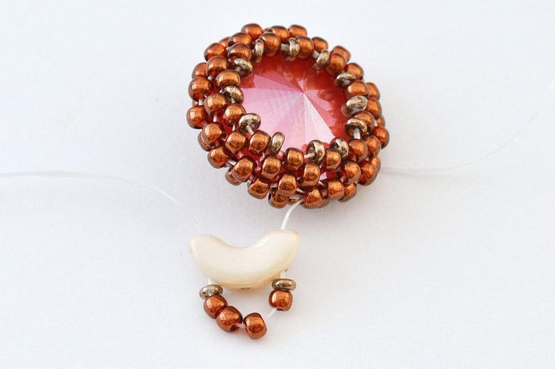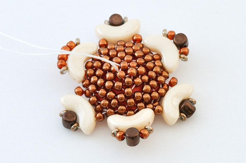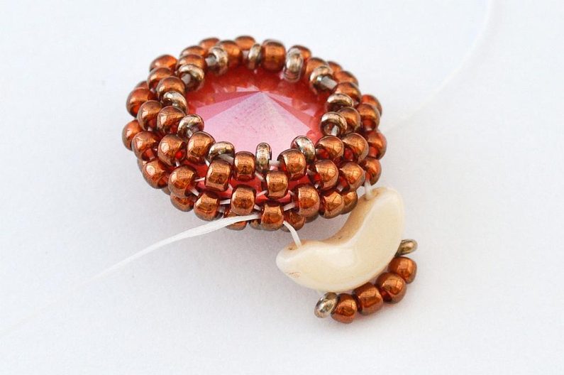 Nakonec nit ještě jednou protáhneme skrz očko pro zavěšení (1× AP, 1× TDR11, 4× TR11, 1× TDR11, 1× AP) a poté provlékáme korálky TR11 tak dlouho, až se zezadu uprostřed setká s druhým koncem. Oba konce pevně svážeme a protáhneme několika TR11 tak, abychom do nich schovali uzlík. Konce nití ustřihneme.