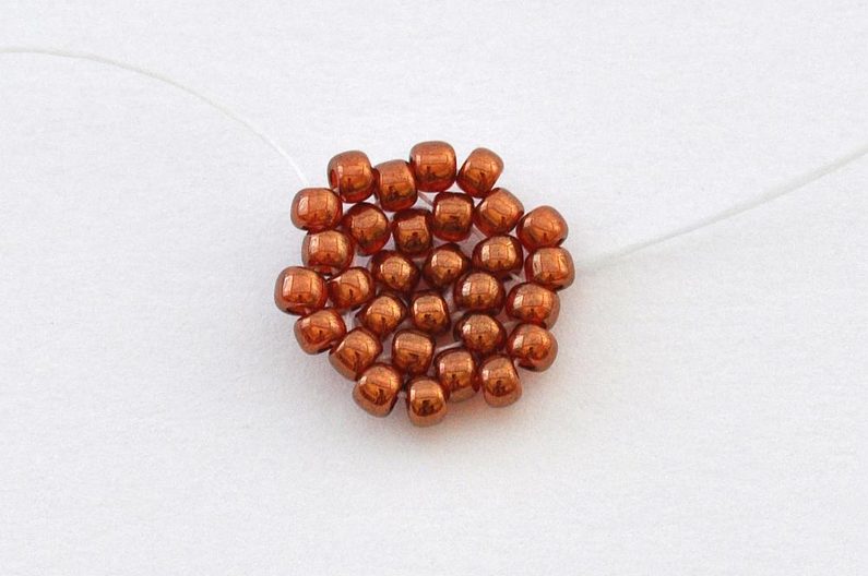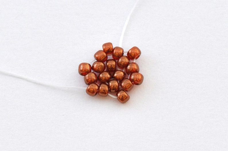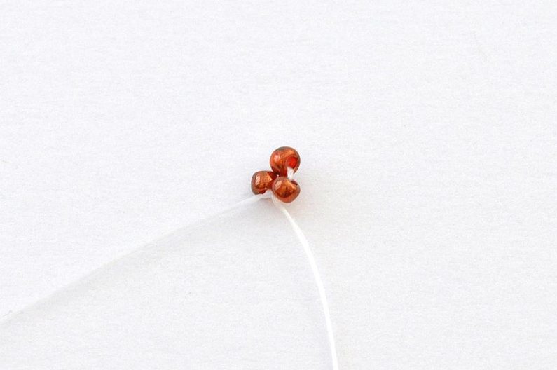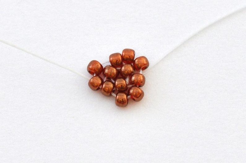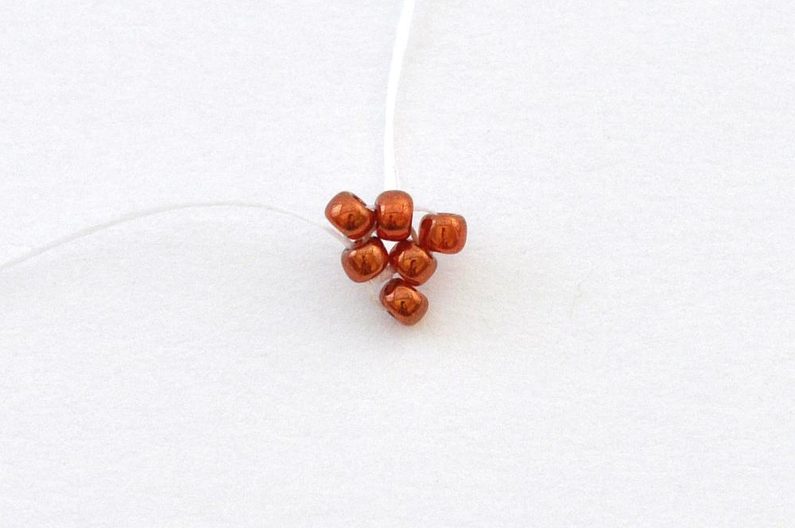 Navlečeme 1× AP jeho krajní dírkou, 1× TDR11, 1× TR11, 1× MP, 1× TR11 a 1× TDR11 a nit provlečeme druhou krajní dírkou korálku AP.