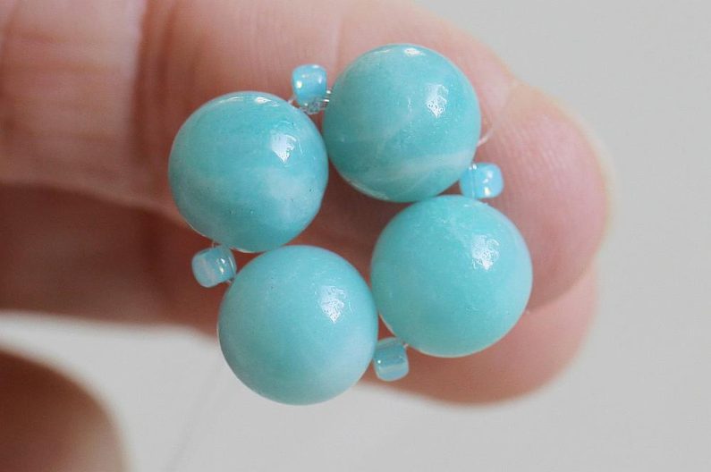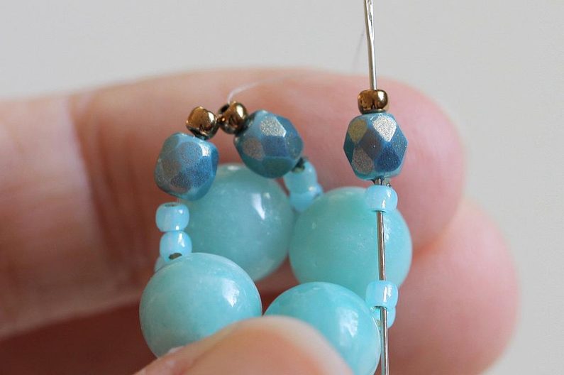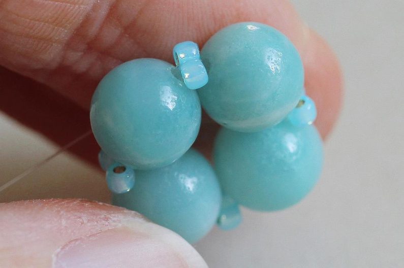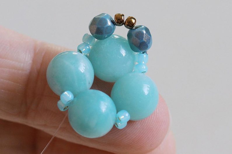 Ustřihneme si cca 70 cm dlouhý vlasec, navlékneme na něj jehlu a poté 4 kusy 8mm korálků z amazonitu. Spojíme je třemi uzlíky v kroužek tak, aby volný konec (bez jehly) byl dlouhý cca 8 cm.