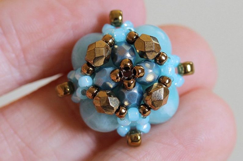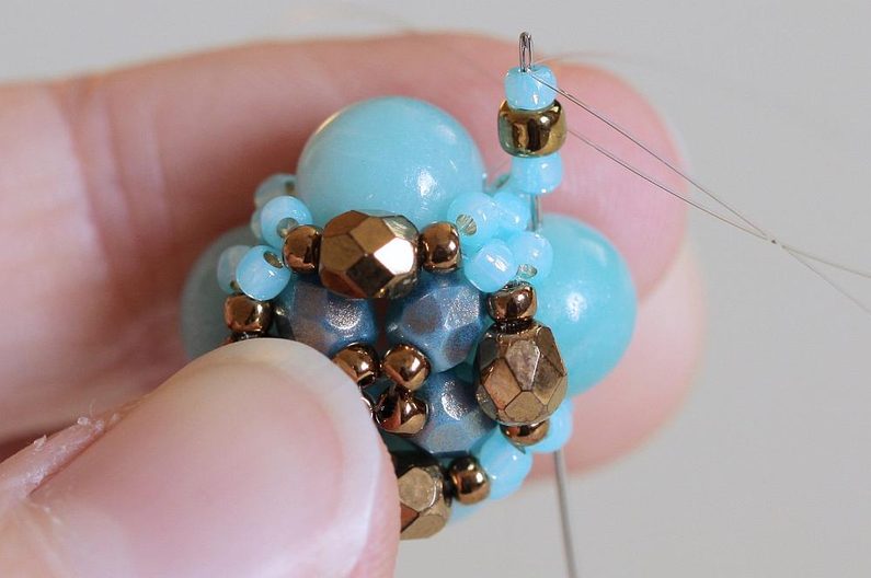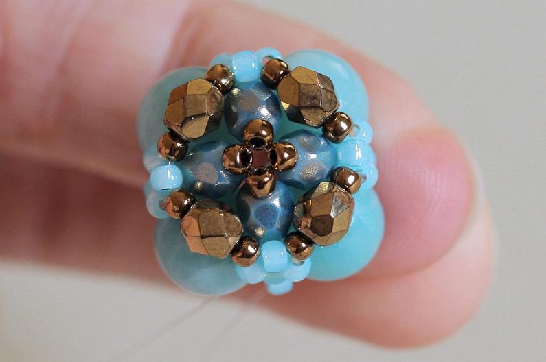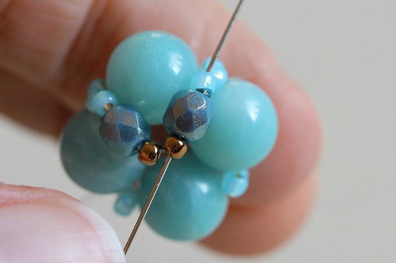Jehlu protáhneme korálky tak, aby nám vycházela z amazonitu. Do mezírky mezi amazonity všíváme 3 korálky po celém obvodu: 1× tyrkysový TR11, 1× hnědý TR8 a opět 1× tyrkysový TR11. Pro zpevnění ještě jednou protáhneme všechny špičky po celém obvodu, až se dostaneme k druhému volnému konci vlasce, takže můžeme oba konce několika uzlíky uzavřít a zapošít.