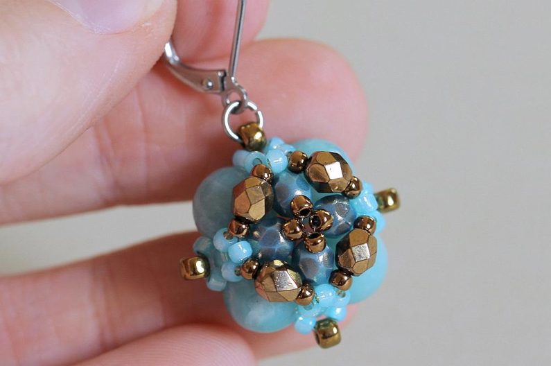 Nyní už zbývá jen náušnici dokončit tak, že pomocí kleští rozevřeme 4mm kroužek, nasadíme jej na jednu ze špiček náušnice (protáhneme dírkou v TR8), přidáme háček a kroužek zavřeme. Hned se můžeme vrhnout na druhou náušnici do páru. :)