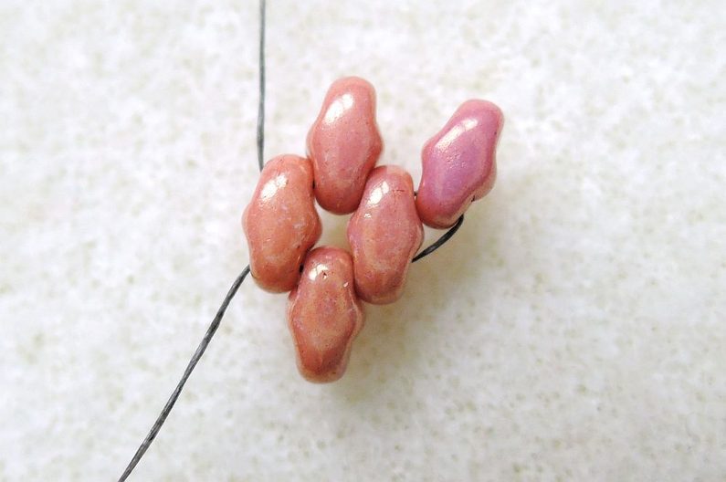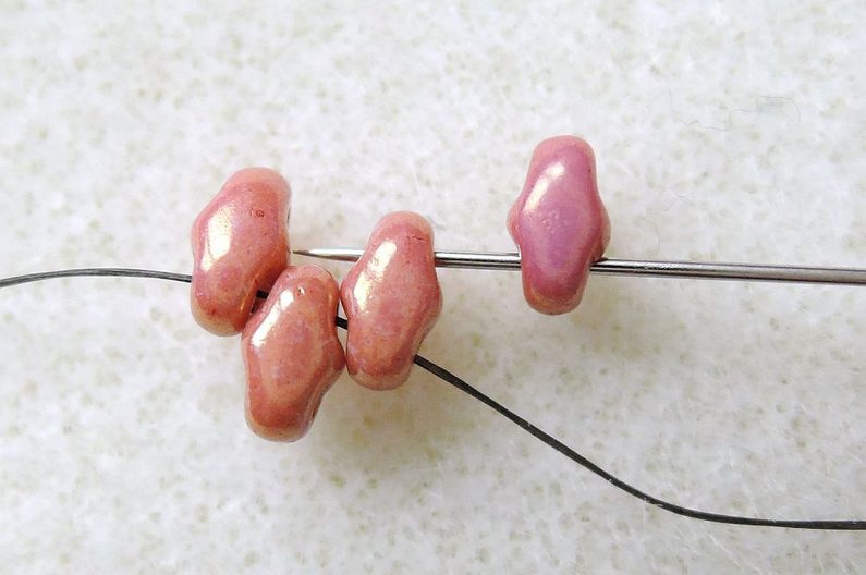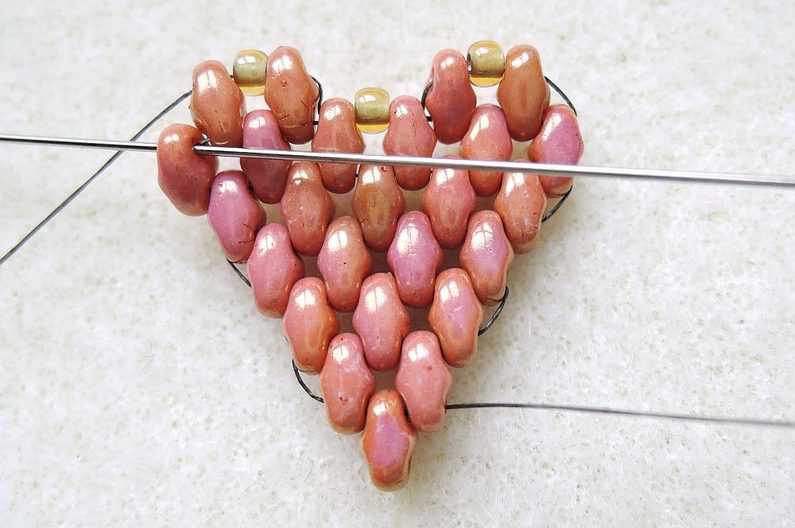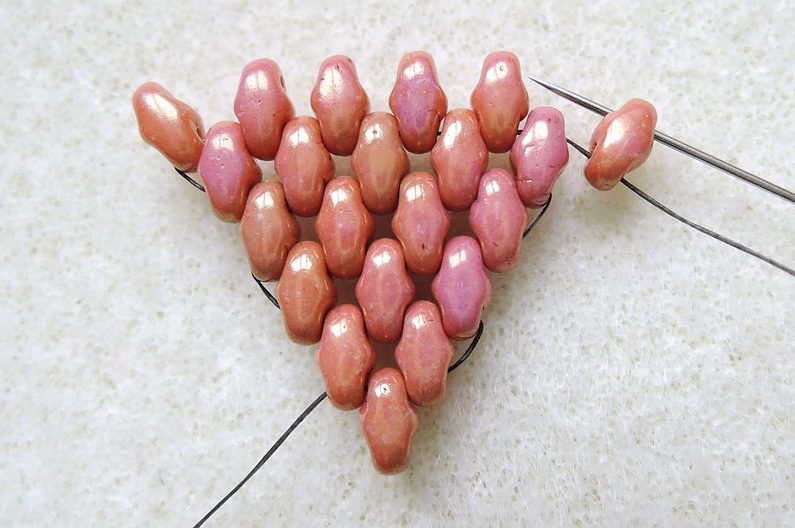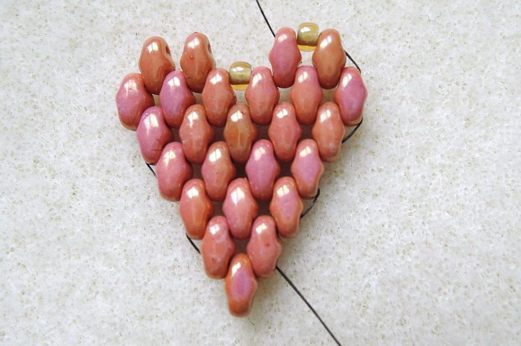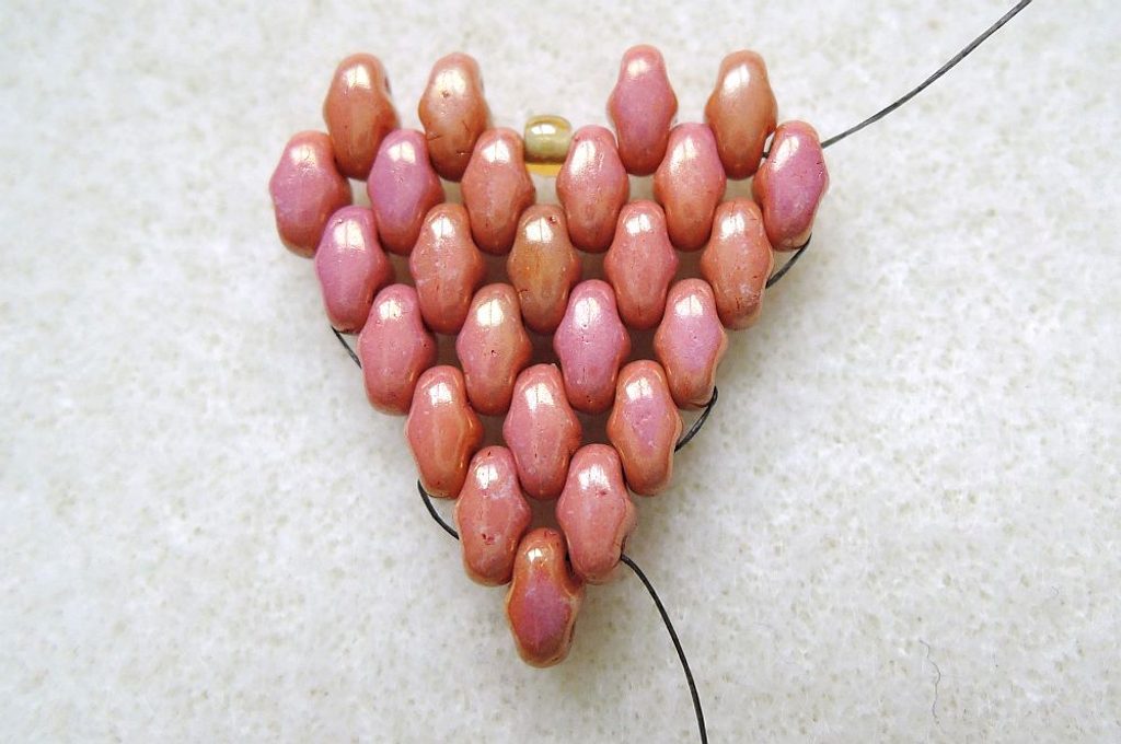 4. řada (celkem 4 Miniduo): Zároveň se přidává první rokajl čtvrté řady – Fireline vychází spodní dírkou posledního přidaného korálku Miniduo z přechozí řady, nyní si zprava přidejte nové Miniduo (volnou dírkou nahoru) a prošijte horní dírkou poslední přidané Miniduo z předchozí řady, další dva do mezer a poslední stejně jako v předchozí řadě.