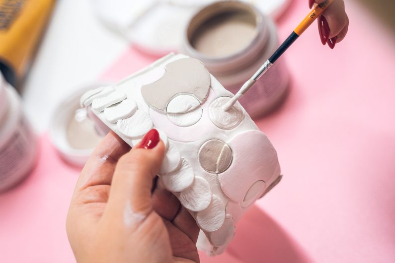 Vše necháme minimálně 48 hodin vyschnout a zatvrdnout. Poté můžeme dekorovat. Na zdobení použijeme akrylové barvy (na větší plochy) a akrylové fixy (na detaily). Vše zalakujeme bezbarvým lakem ve spreji.
