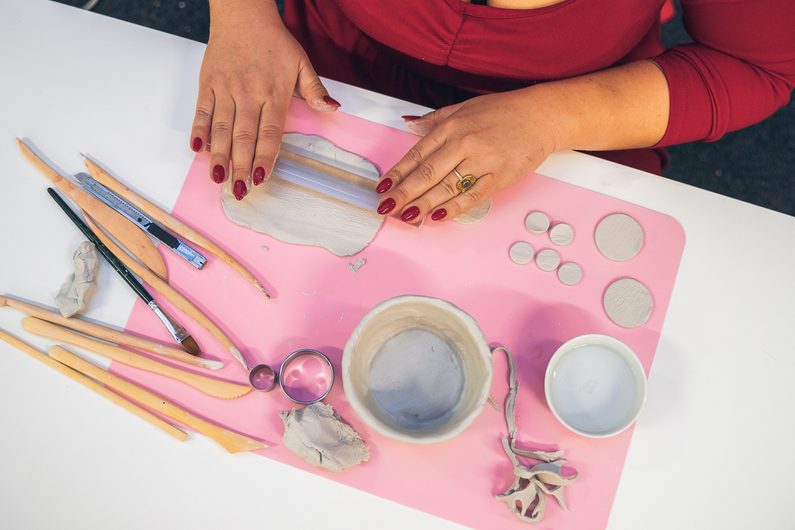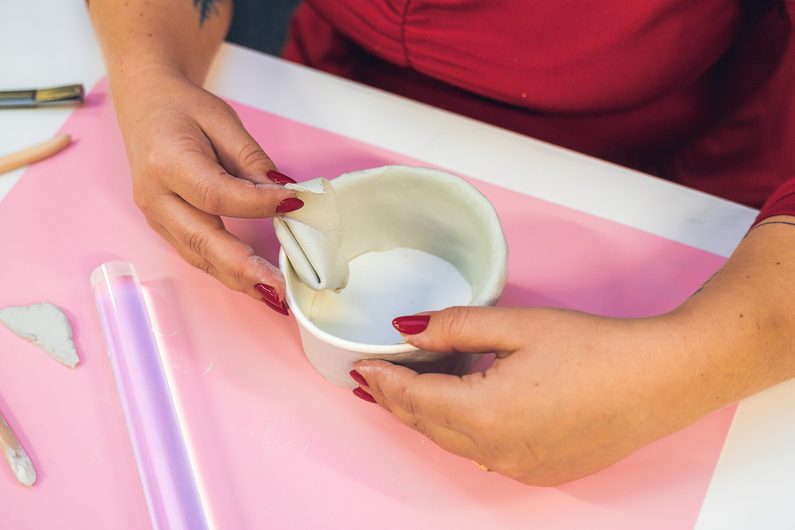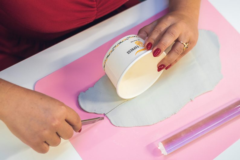 Ze samotvrdnoucí hmoty si vyválíme tenký plát. Podle velikosti kelímku si ho uřízneme ulamovacím nožem do požadované šířky i délky.