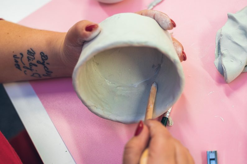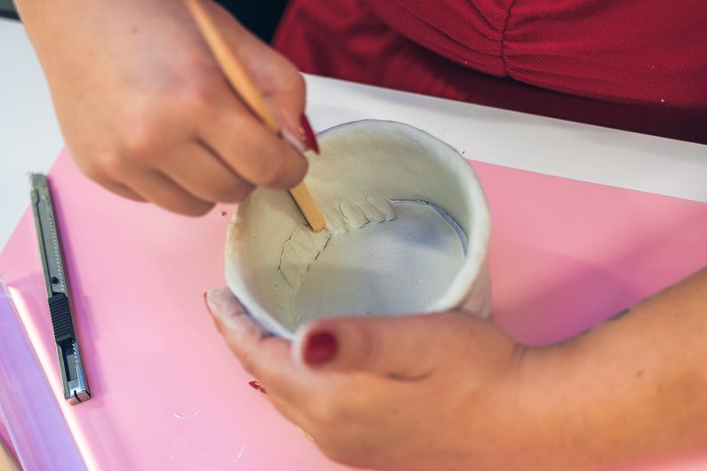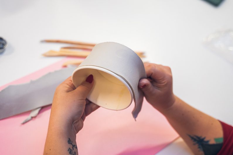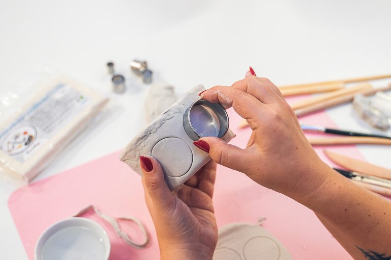 Na dekoraci můžeme zvolit jakýkoliv vzor. My jsme si hráli s motivem kruhu. Malými kolečky vytvořenými pomocí vykrajovátka jsme ozdobili vrchní okraj. Na boky jsme připevnili větší kolečka a pro zajímavější reliéf jsme vykrajovátkem také obtiskli tvar kruhu.