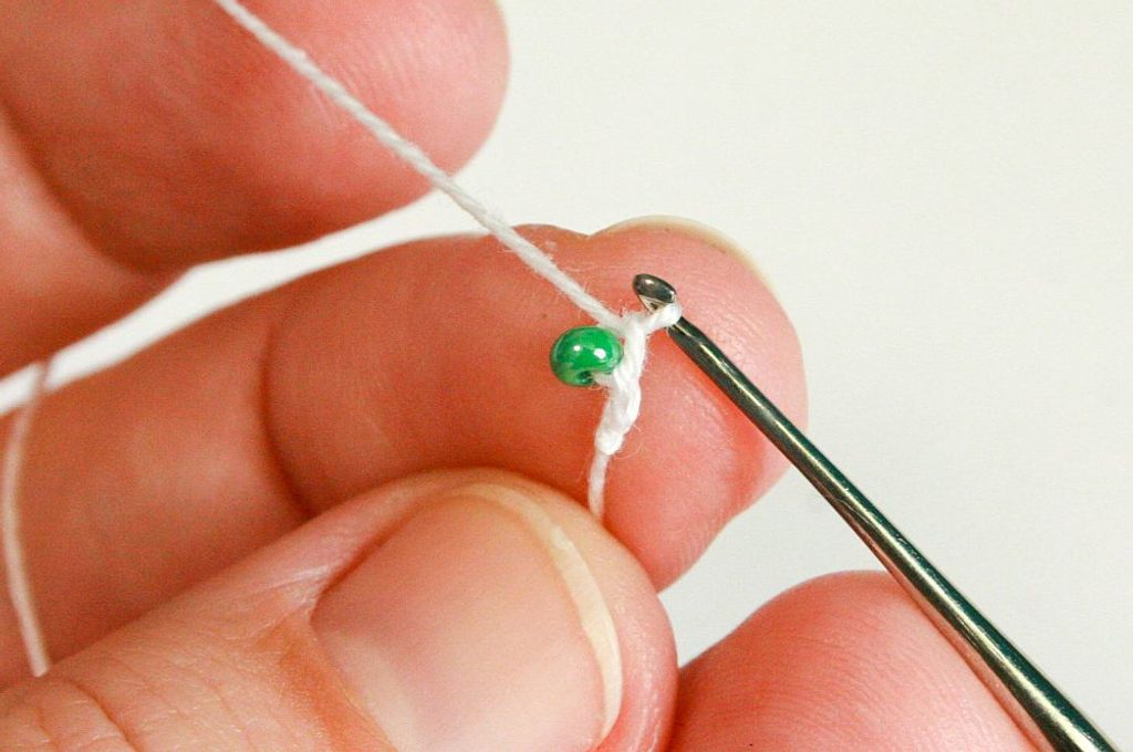 Pak háček zapíchněte do očka zleva od první perličky (Obr.17). Otočte perličku dospodu a doprava. Posuňte co nejblíže další perličku a háčkem zachyťte přízi a uháčkujte pevné očko (protáhněte přízi oběma oky najednou (Obr.18-20).